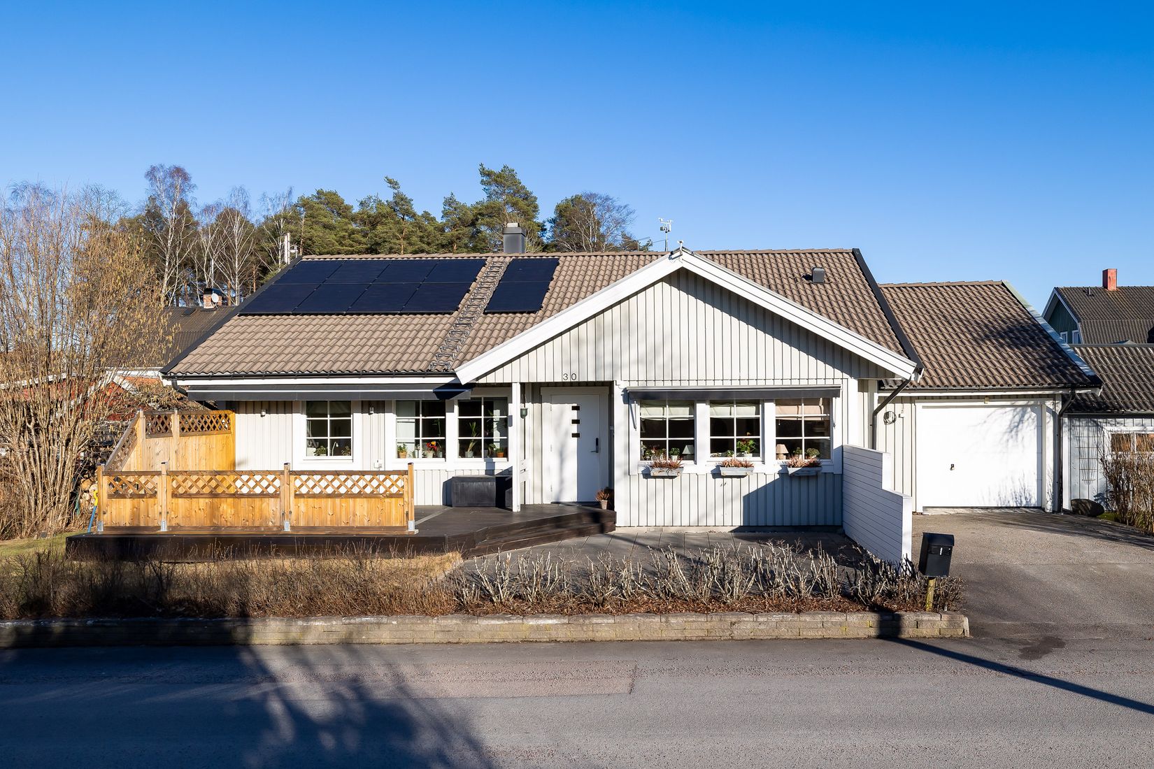 Här erbjuds ett modernt, energieffektivt och driftsäkert boende med installerade solpaneler - ett hem som kombinerar komfort med smarta energilösningar. Det vidbyggda garaget nås smidigt inifrån huset och bidrar till vardagens bekvämlighet.