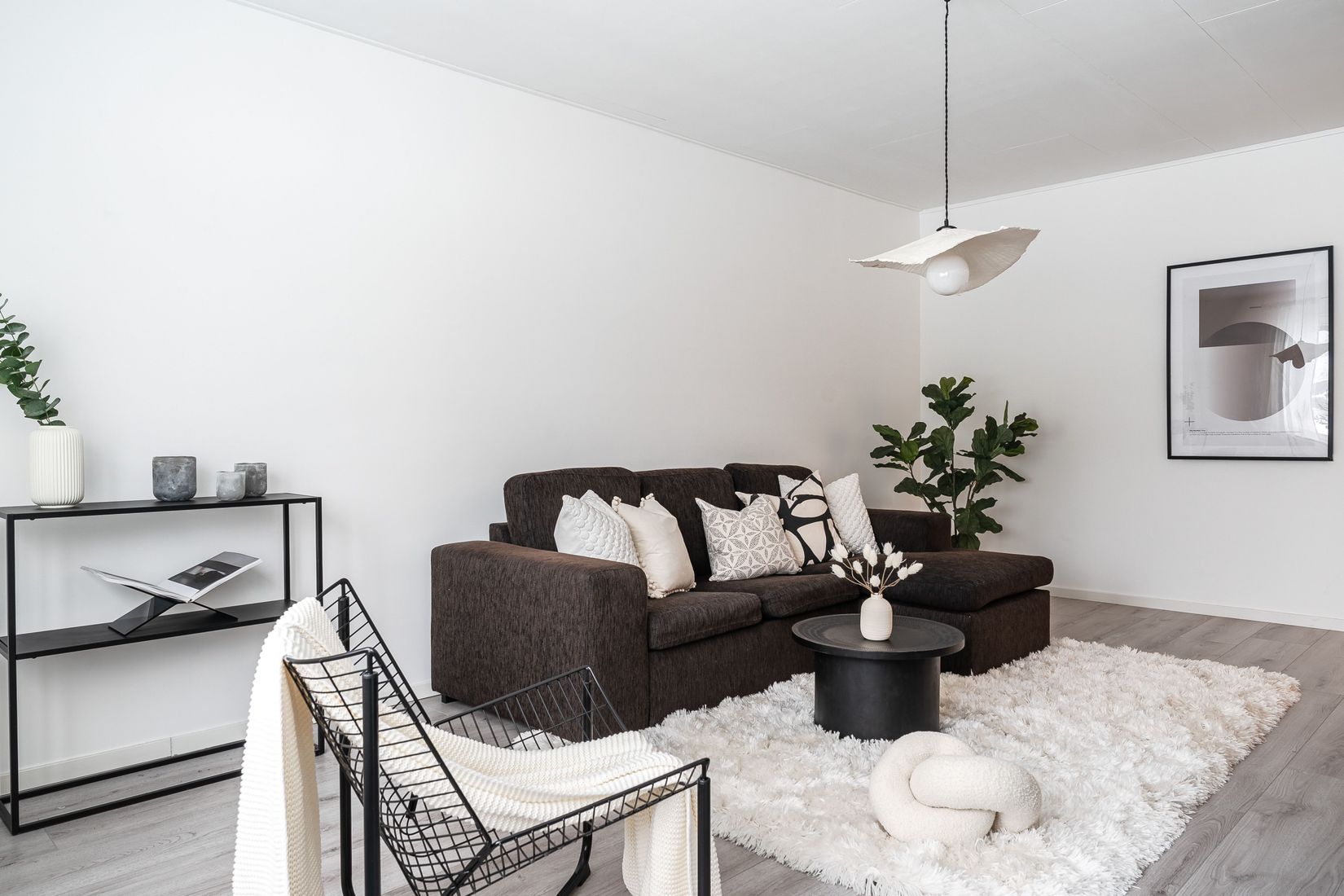 Vardagsrummet är luftigt och erbjuder fönsterpartier som vetter mot öst. Ljust och rymligt sovrum där möjlighet till förvaring finns.