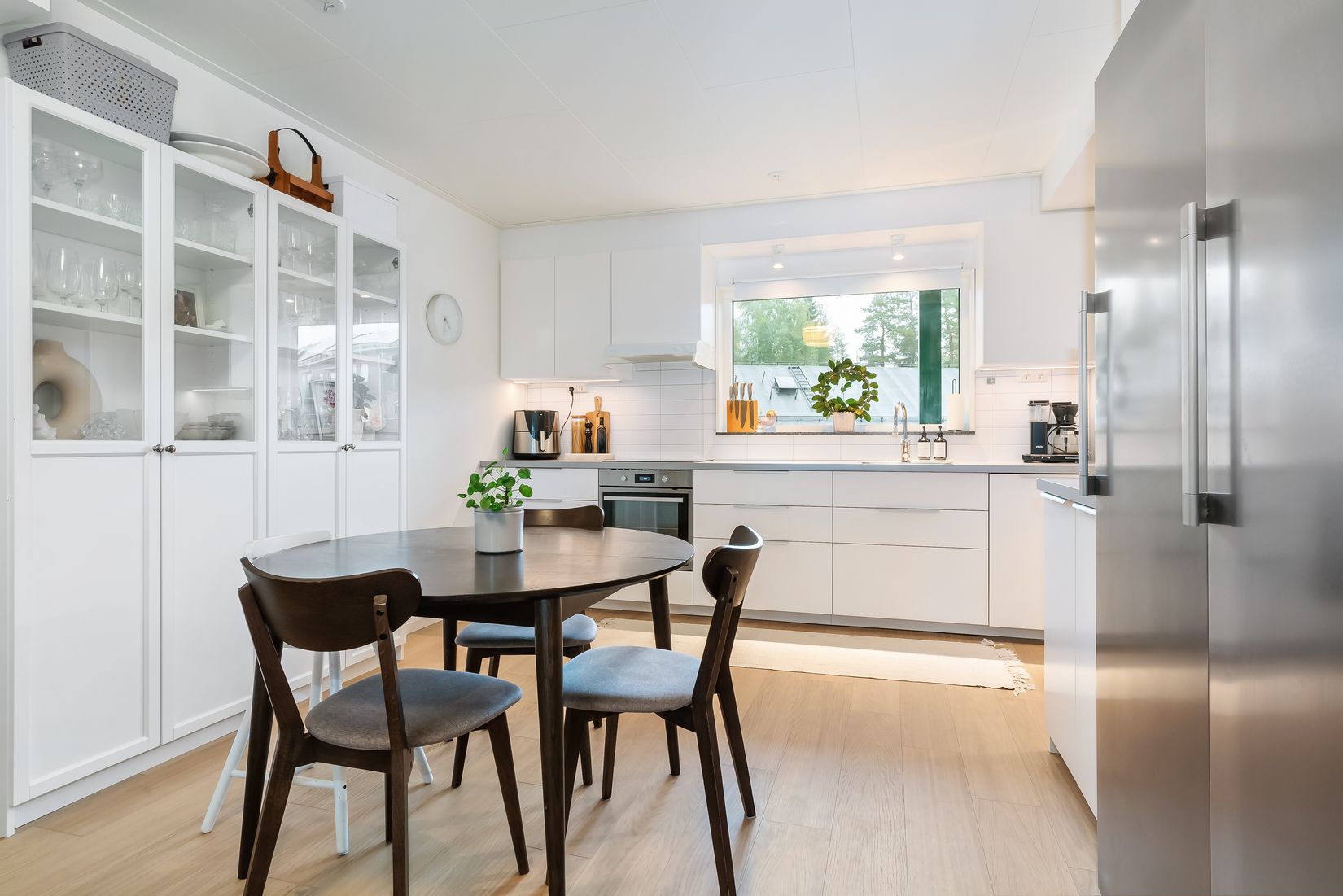 De högkvalitativa vitvarorna och badrumsmöblerna gör att du kan njuta av lyx och komfort i vardagen. Bostaden är belägen i ett lugnt och trivsamt område, med naturen och elljusspåret runt hörnet och närhet till sjön Runn.