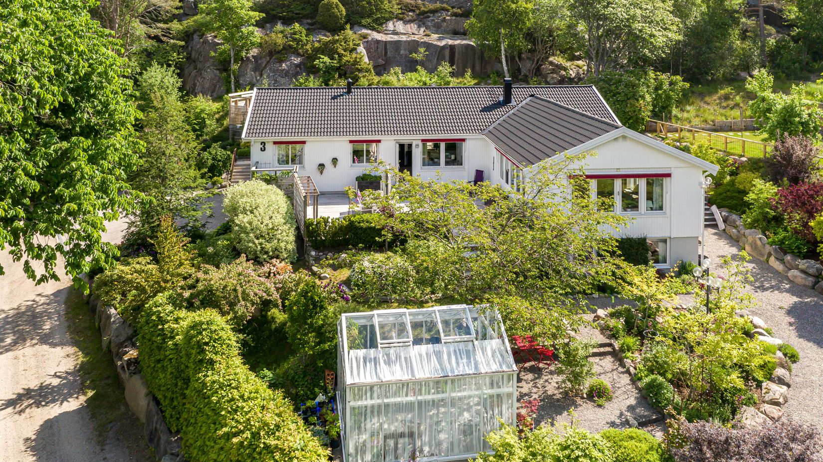 Väl ute på tomten hänförs man av den otroliga trädgården, här har säljaren byggt upp oas av växter, uteplats och växthus.