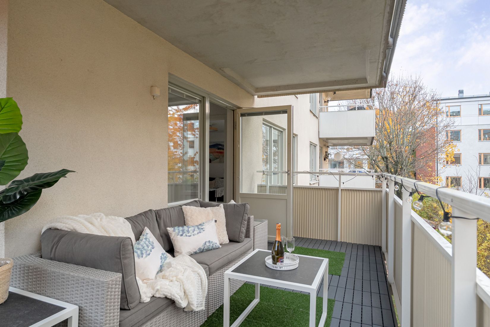 - Stor hörnbalkong i söderläge med sol från förmiddag till kväll mot innergård.
