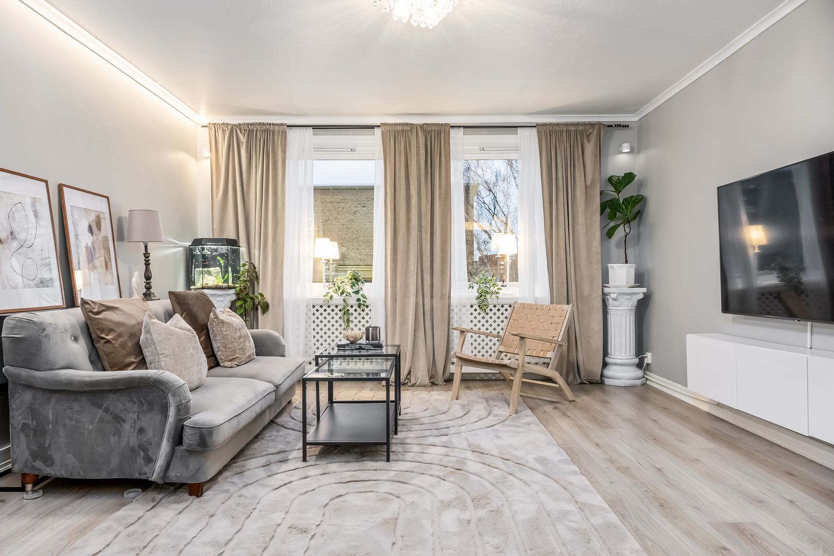 Lägenheten bjuder på genomgående ljusa ytskikt och en öppen planlösning mellan det moderna köket, matplatsen och vardagsrummet.