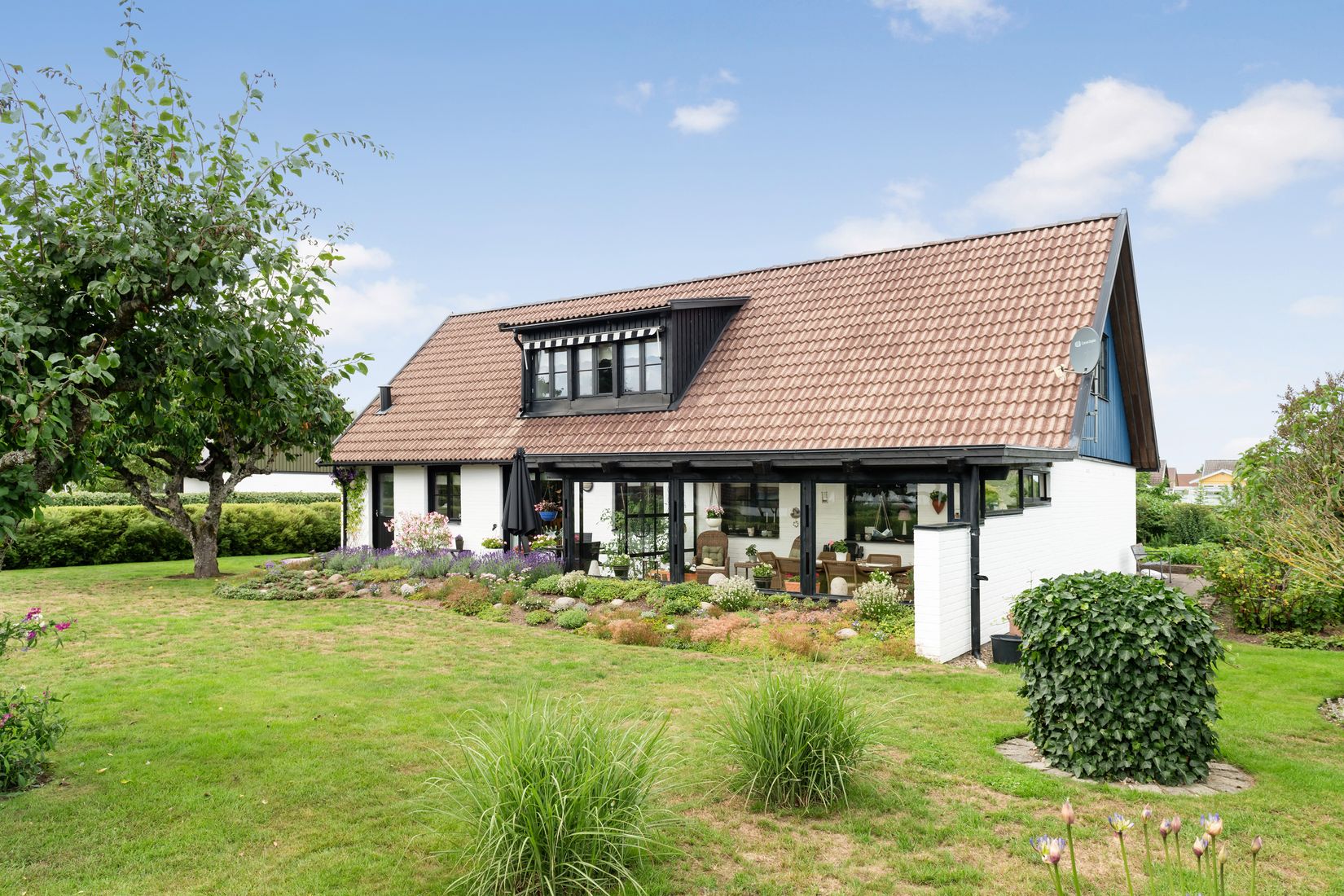 Trädgården är en härlig oas med mycket blommor, buskar och träd som skapar en trevlig atmosfär. Här finns utrymme för lek och spring med barnen, plantering och odling för den med gröna fingrar samt avkoppling i antingen uterummet eller kanske en solstol på den stenlagda uteplatsen. På tomten finns även ett garage, ett isolerat förråd samt en asfalterad uppfart med plats till bilen.