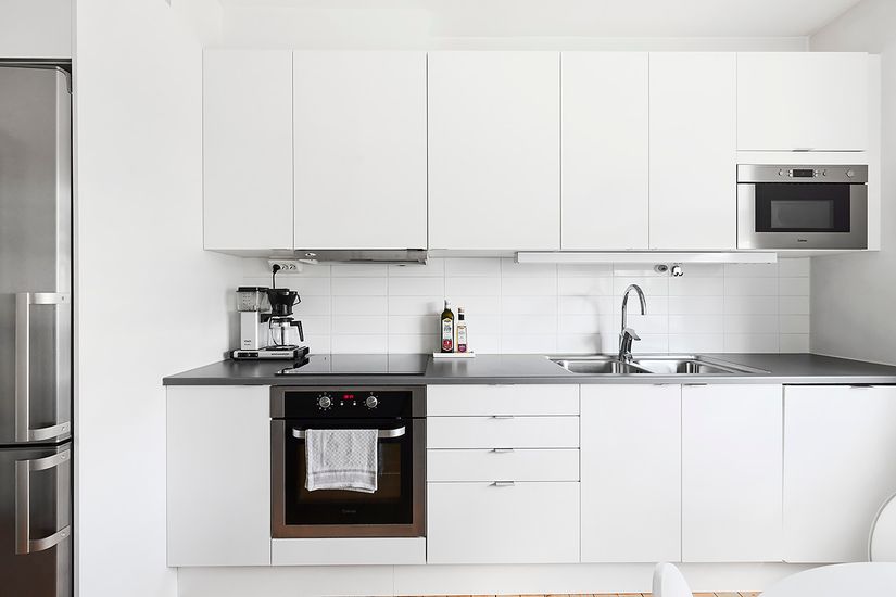Interiört ett vitt kvalitetskök med fina vitvaror och väldisponerade ytor. Ett väl tilltaget vardagsrum och ett sovrum som ansluter sig till balkongen i väderstreck norr. Soft att stiga i morgonrocken och tofflorna och förflytta dig ut hit under sommarmorgnar.