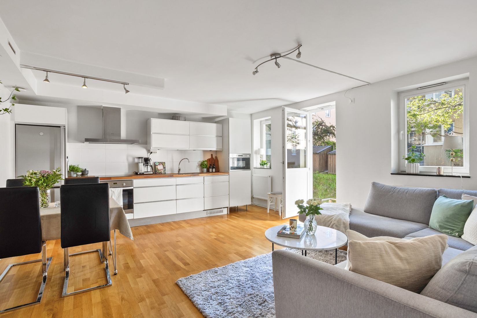 Bostaden erbjuder generösa sällskapsytor med ett lättmöblerat vardagsrum i öppen planlösning mot det stilrena köket. Från vardagsrummet nås lägenhetens egna uteplats i västerläge. Här kan ni tillaga mat på grillen och njuta av soliga, underbara kvällar. Uteplatsen nås enkelt från både vardagsrummet och köket. Köket är välutrustat med diskmaskin, kyl/frys, spishäll och ugn. Sovrummet rymmer en dubbelsäng och erbjuder praktisk förvaring. Det fräscha, helkaklade badrummet är utrustat med golvvärme och en ny tvättmaskin. Lägenheten har genomgående goda förvaringsmöjligheter samt tillhörande förråd på vinden.