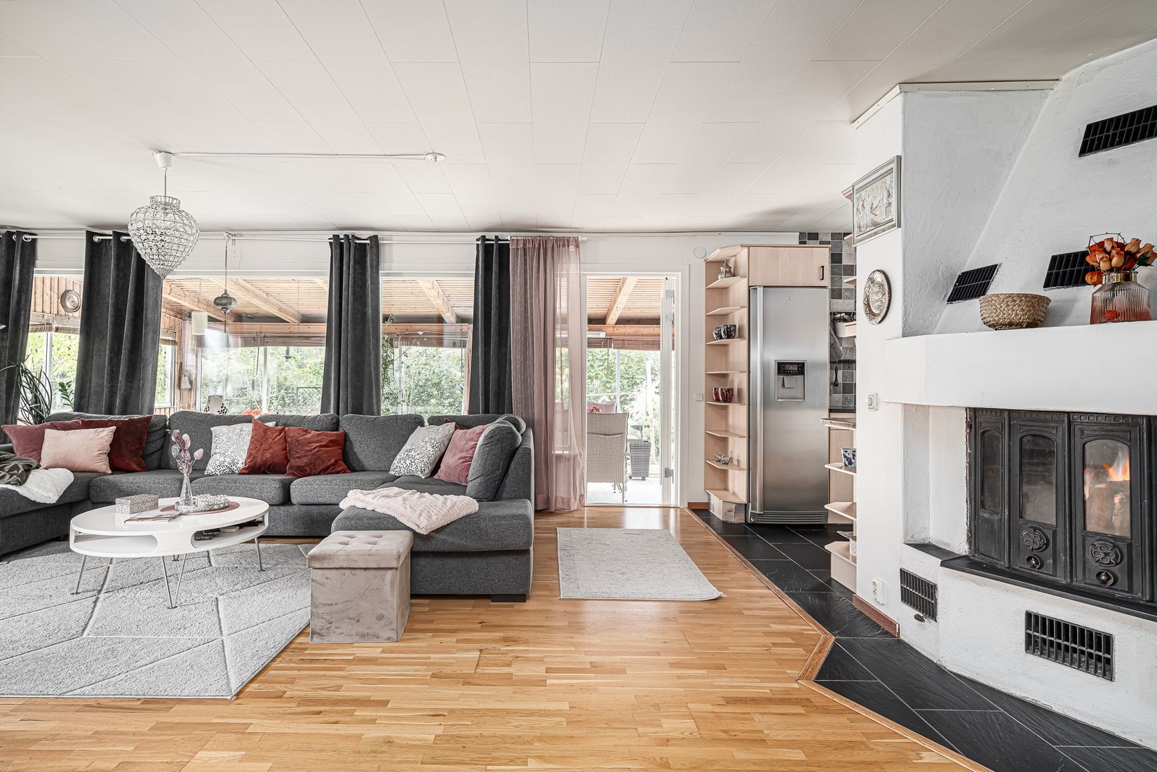 Huset erbjuder en öppen och social planlösning i ett plan, där det rymliga vardagsrummet smälter samman med det stilfullt renoverade köket – utrustat med gott om förvaringsmöjligheter och generösa arbetsytor. I direkt anslutning till både kök och vardagsrum finner du ett stort och inbjudande uterum – en perfekt plats för avkoppling eller umgänge med familj och vänner, oavsett årstid.