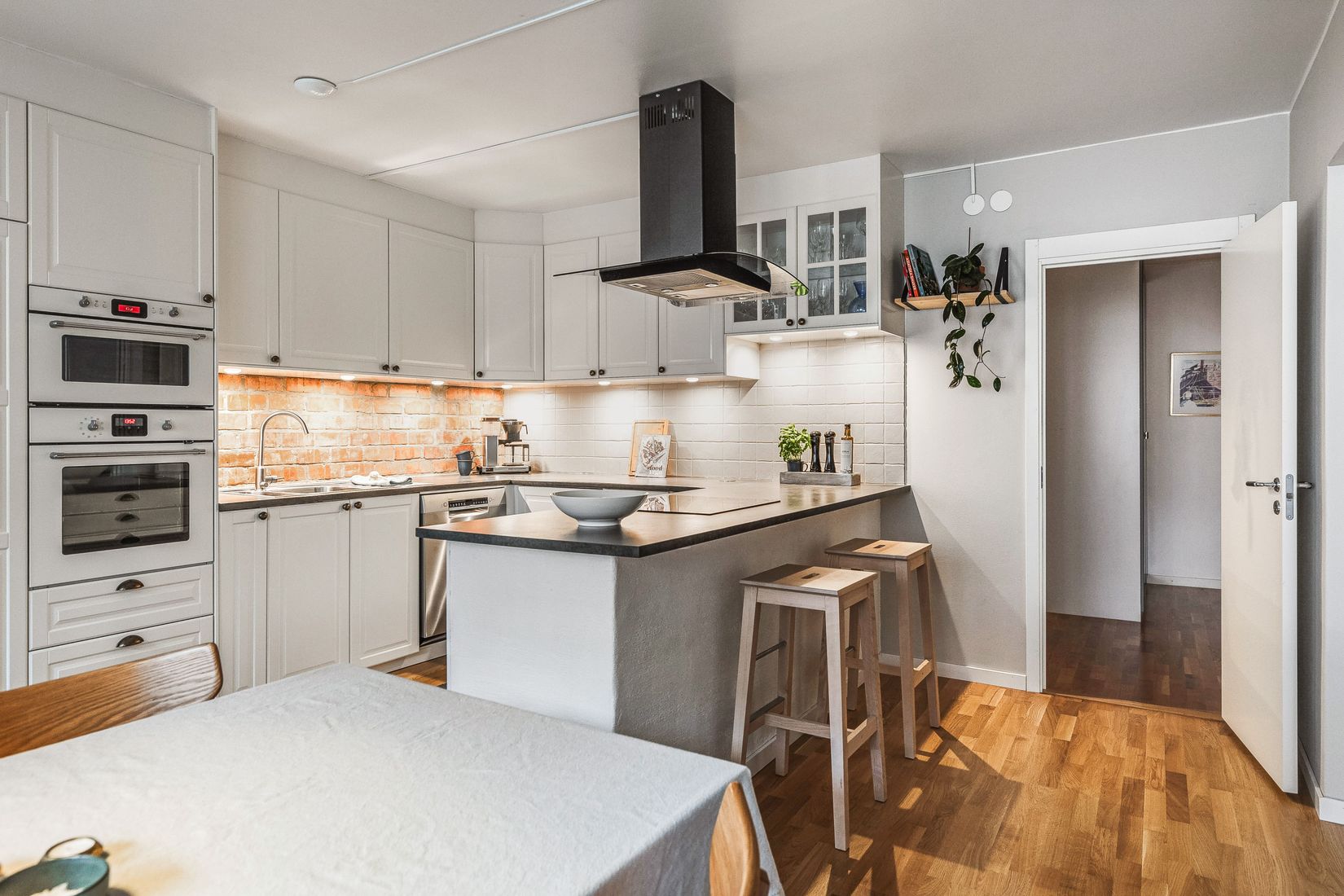 Två av sovrummen har inbyggda tidsenliga garderober medan det tredje istället kan nyttjas som kontor, middagsrum, bibliotek eller liknande. Hit leder tjusiga pardörrar i glas och det är samma golv som i vardagsrummet, vilket gör det till en naturlig del av umgängesytan om man så vill.