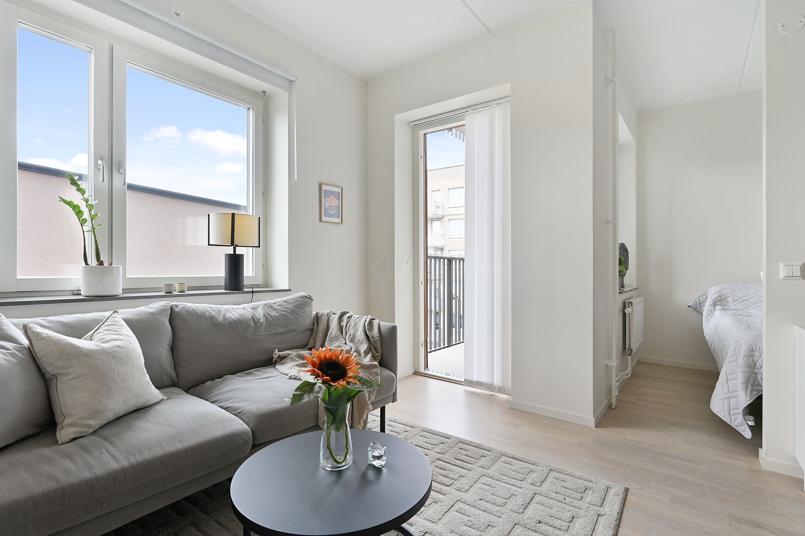 Härifrån leder dörren vidare ut till balkongen – en perfekt plats för morgonkaffet, kvällsluften eller bara en stund i stillhet.