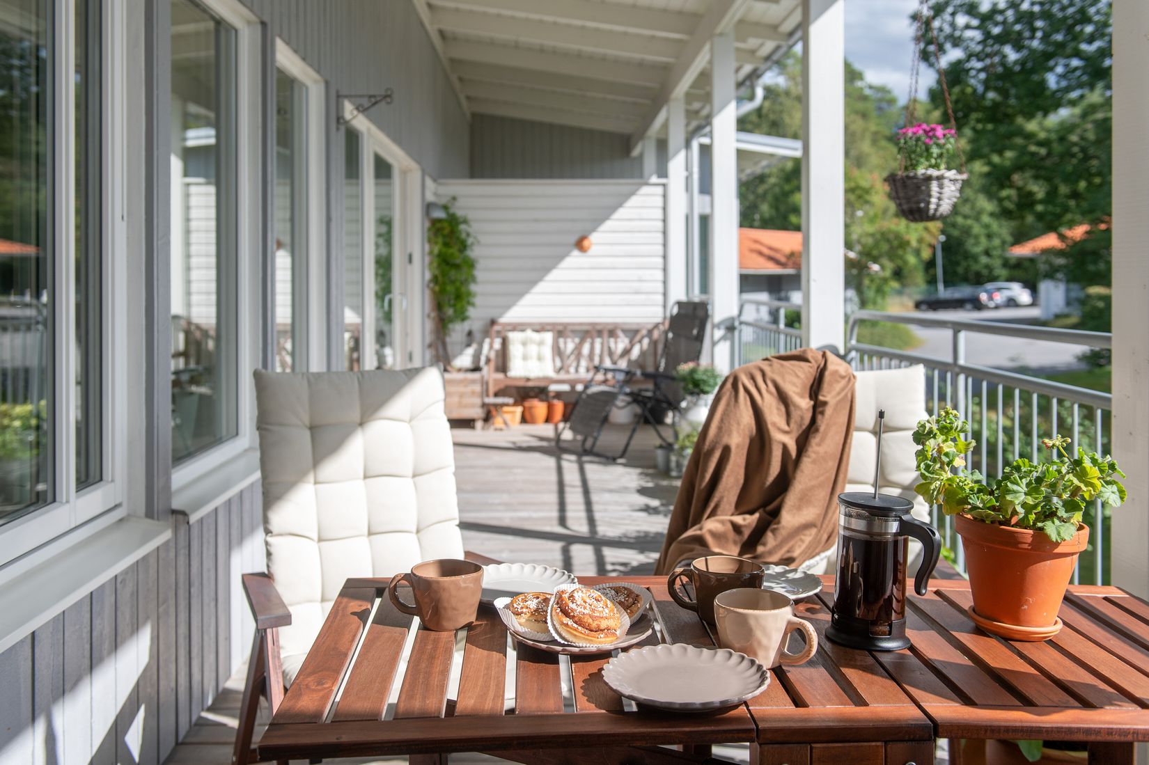 I köket hittar vi utgången till bostadens underbara balkong, sol hela dagen och plats för matbord och stolar. Här kan du njuta av både frisk luft och solens strålar tillsammans med nära och kära. Vid entrén finns också möjlighet att ta en kvällsfika och avnjuta en härlig kvällssol.