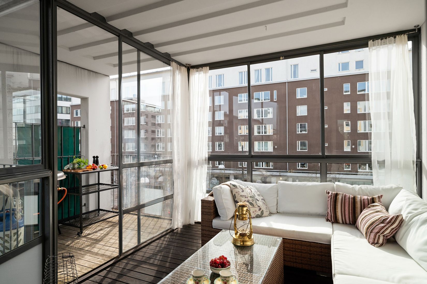 När kvällen kommer lockar den stora inglasade balkongen i söderläge. Här kan ni sola under dagen, äta middag utomhus och sedan mysa vidare långt in på kvällen, skyddade från vinden men med himlen som tak. En alldeles egen oas mitt i staden.