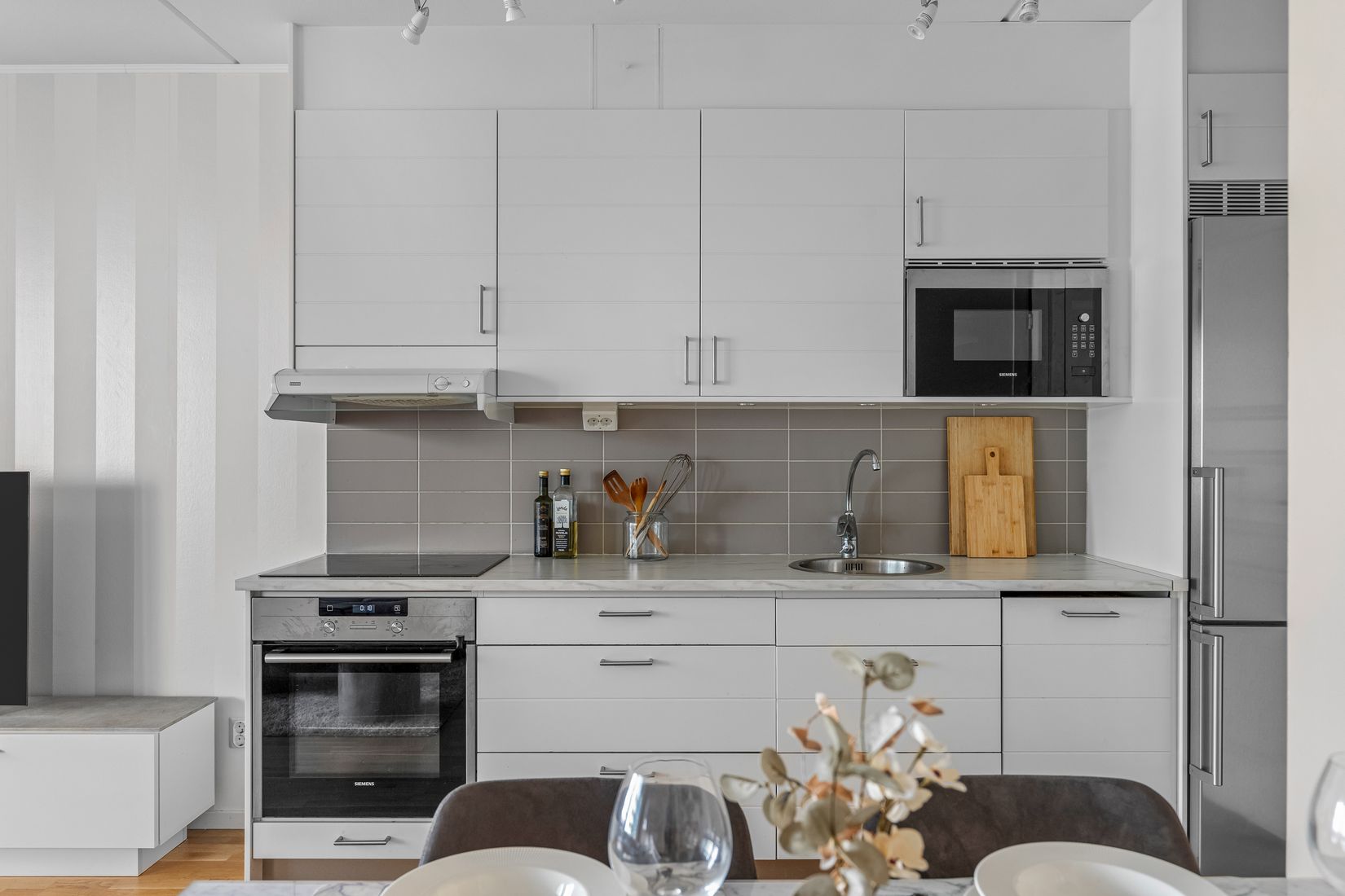 Från entrén möts ni av en hall med utmärkt förvaring i flera garderober. Intill hallen finns ett sovrum och ett fräscht, helkaklat badrum med golvvärme samt en kombinerad tvättmaskin och torktumlare. Vidare in i bostaden hittar ni ett fullt utrustat kök med öppen planlösning mot vardagsrummet, perfekt för sociala tillställningar. Från vardagsrummet når ni enkelt den härliga balkongen som vetter mot gården. Denna bostad erbjuder rymliga ytor, fräscha ytskikt och ett fantastiskt ljusinsläpp, vilket tillsammans skapar en underbar atmosfär.