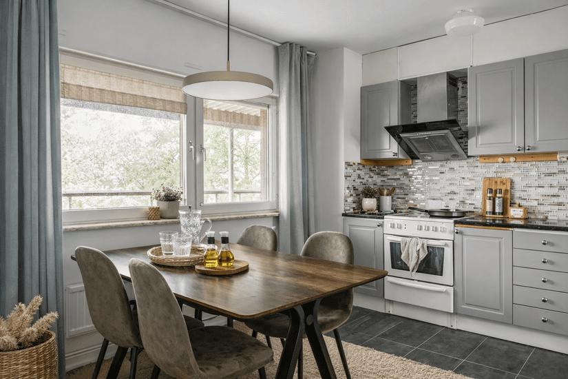 Det stilfulla köket är en dröm för matlagningsentusiaster. Utrustat med vitvaror och generösa arbetsytor, blir matlagningen en ren fröjd. Här finns också en rymlig matplats där hela familjen kan samlas för trevliga middagar.