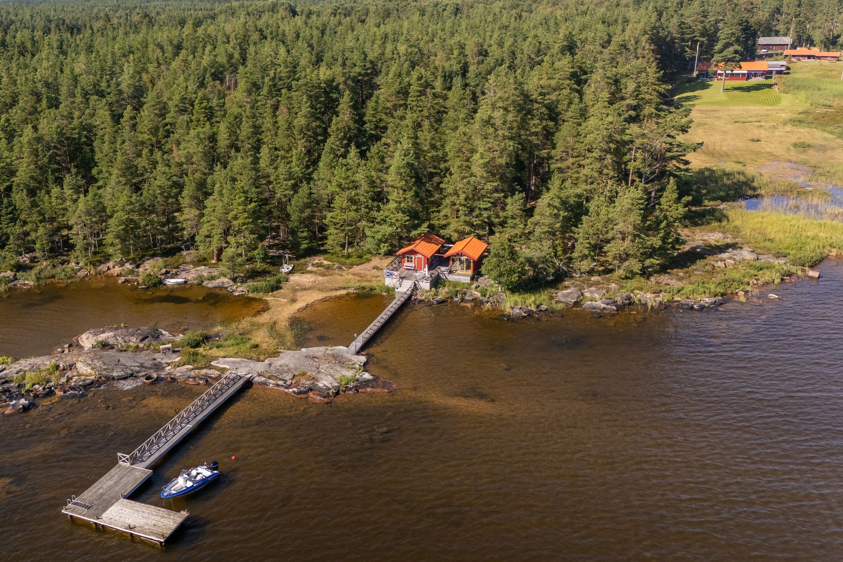 Fritidshuset med åretruntstandard och övriga byggnader kompletterar platsen väl, men det är sjötomten som verkligen definierar denna fastighet. Här lever du i direkt kontakt med vattnet, oavsett om du söker stillhet, rekreation eller ett aktivt liv vid s