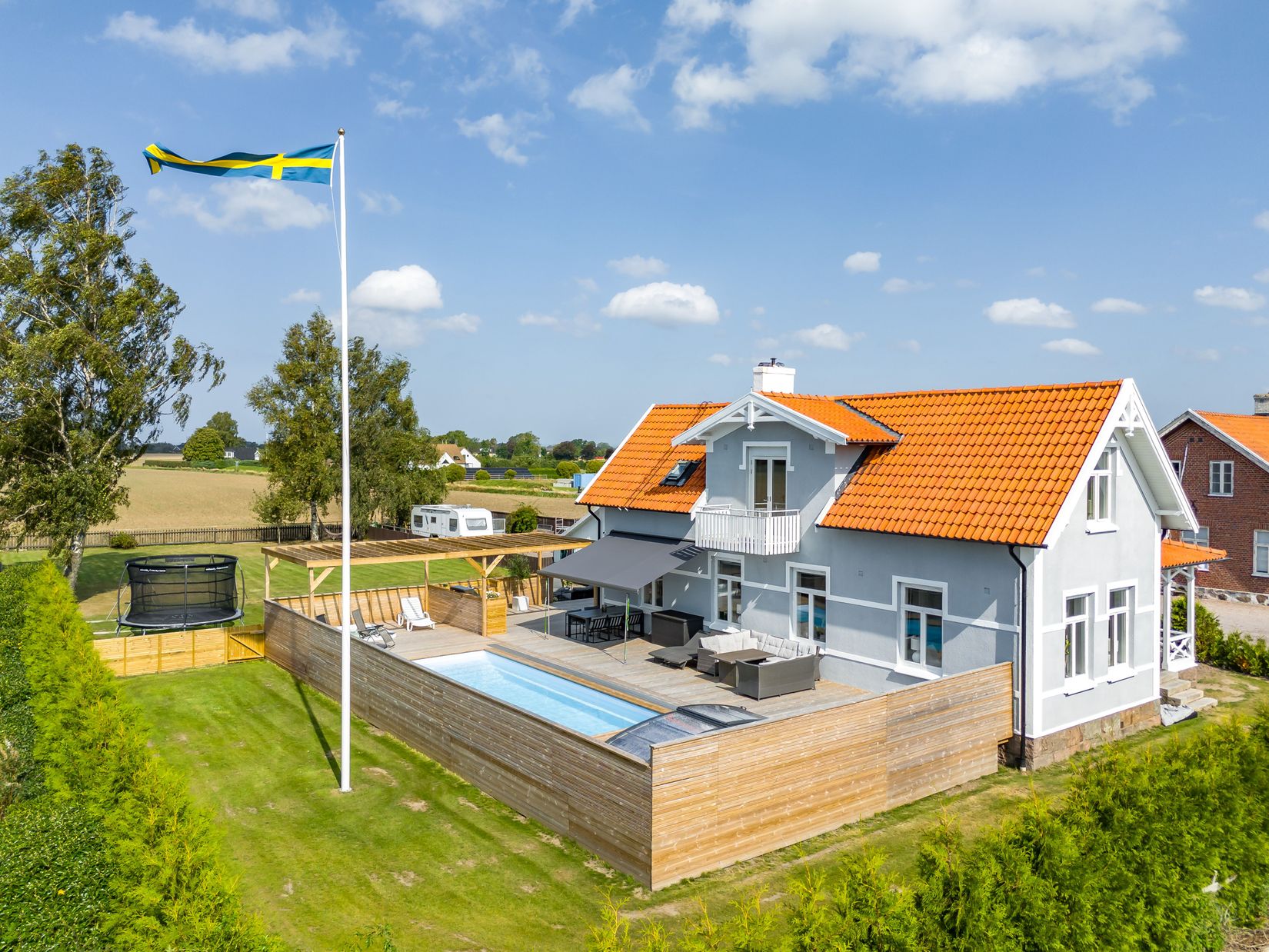 Varje rum i huset har generöst med naturligt ljusinsläpp och erbjuder en varm och välkomnande atmosfär. Under dagen fylls rummen med ljus, och på kvällen kan du njuta av den vackra kvällssolen på terrassen – en plats där ni kan koppla av vid det exklusiva uteköket, njuta av ett dopp i jacuzzin eller ta ett svalkande simtag i poolen.