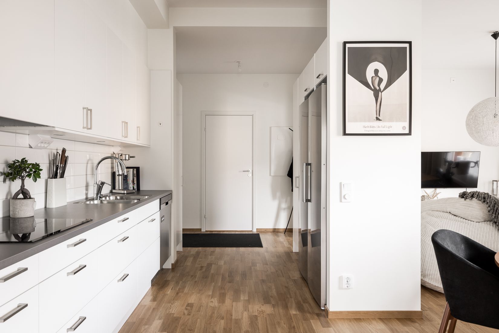 Köket är sobert och tidlöst i vitt med släta luckor, bra förvaring i både över- och underskåp samt en rejäl arbetsbänk som gör matlagningen enkel. Maskinparken är komplett med diskmaskin, häll och kyl & frys i rostfritt. Tack vare den öppna dispositionen mot matplatsen skapas en självklar samlingspunkt där du enkelt dukar för många. I anslutning tar vardagsrummet vid – ljust, lättmöblerat och med plats för både stor soffa och mediemöbel. Härifrån når du även den generösa balkongen.