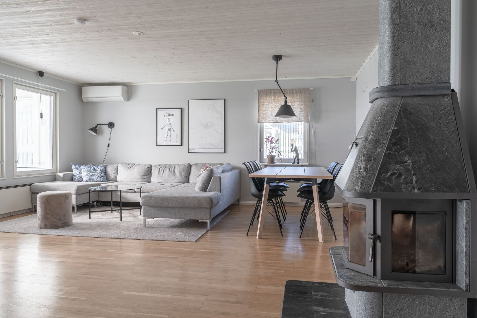 Vidare till vardagsrummet som stoltserar med en gedigen yta för möblemang efter egen smak och tycke. Utrymme finns för både soffgrupp, tv-möbel samt ett matsalsbord. Allt detta att avnjuta invid kamin för extra komfort och värme.