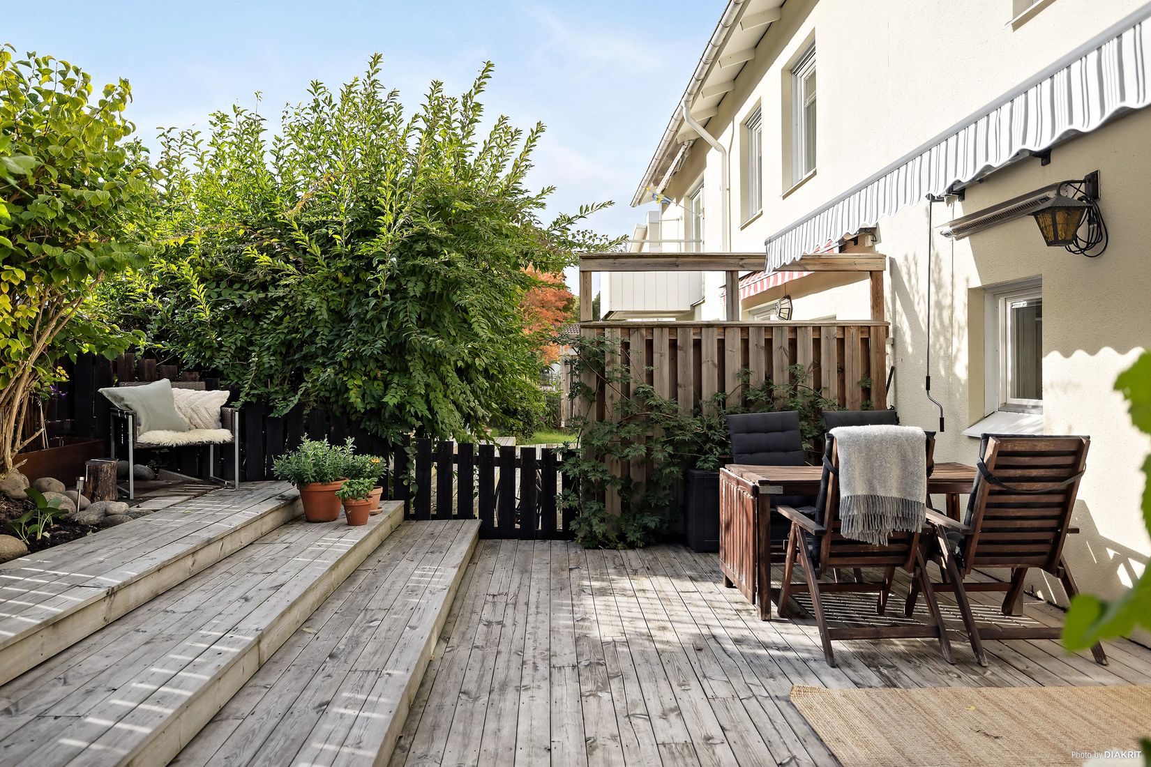 När ni kliver in i bostaden möts ni av en välkomnande hall med plats för avhängning. I direkt anslutning åt vänster finner ni tvättstugan - perfekt för det praktiska i vardagen! Fortsätter ni in i bostaden har ni ett stort kök med med genomtänkte färgval som bidrar till en hemtrevlig känsla, här kan ni samla nära och kära till bords. Intill ligger det rymliga vardagsrummet med plats för både soffgrupp och skrivbordshörna. Härifrån nås även bostadens svårslagna uteplats i optimalt solläge. Uteplatsen inger känslan av en egen trädgård för plantering och odling och en stor altan med utfällbar markis - perfekt för att kunna ta tillvara på solens timmar eller luta sig tillbaka i skuggan med en bra bok. Uteplatsen är lättskött och lagom stor med blommande buskar och rabatter samt gräsytor för lek, här finns också en praktisk redskapsbod med extra förvaring. Vidare inne i lägenheten finns två stora sovrum samt ett mindre rum som idag används som ett barnrum. Det helkaklade badrummet är b. la. utrustat med badkar och komfortvärme. Bostaden är upplåten som en 3:a men nyttjas idag som en 3,5:a.
