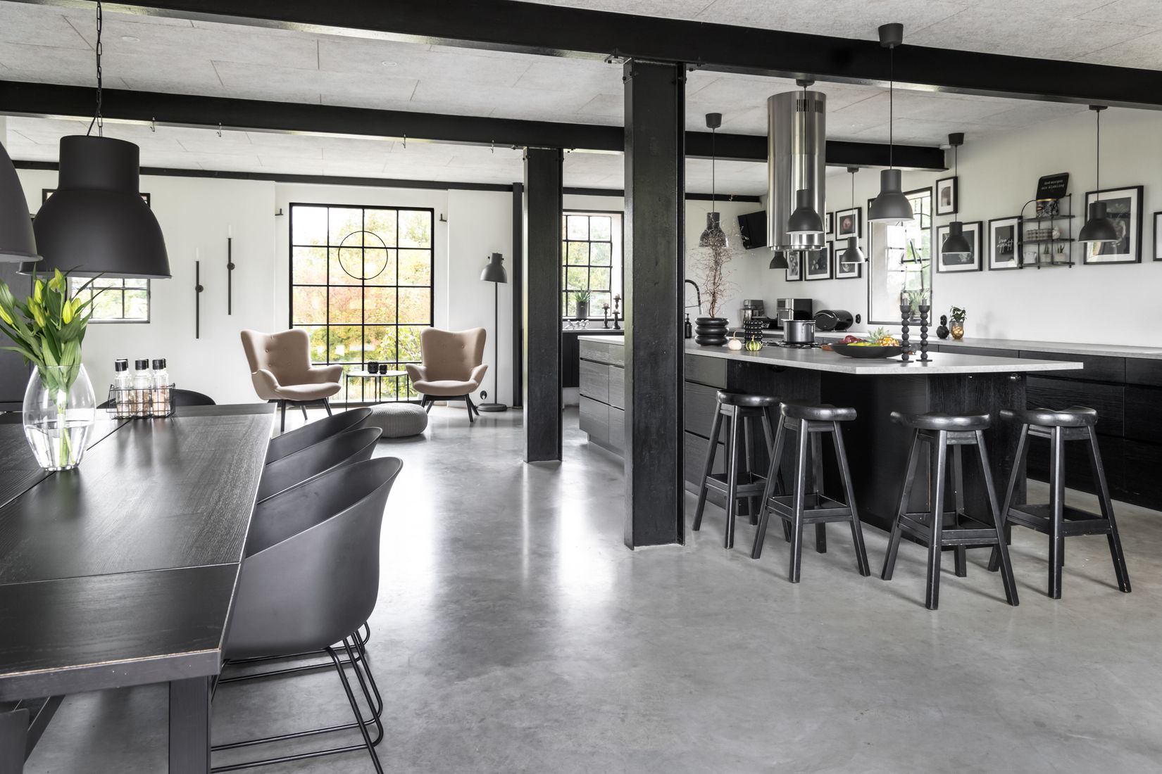 I den andra delen av entréplanet öppnar den sociala och helt unika våningen upp sig. Stort allrum uppdelat i olika avdelningar. De charmiga järnbalkarna hjälper till att dela upp rummet i olika avdelningar. Borterst mot gaveln finns det stora, sociala köket och matplatsen. Även här flödar ljuset in från de stora fönsterpartierna, utgång till trädäck med utsikt över vidderna.
