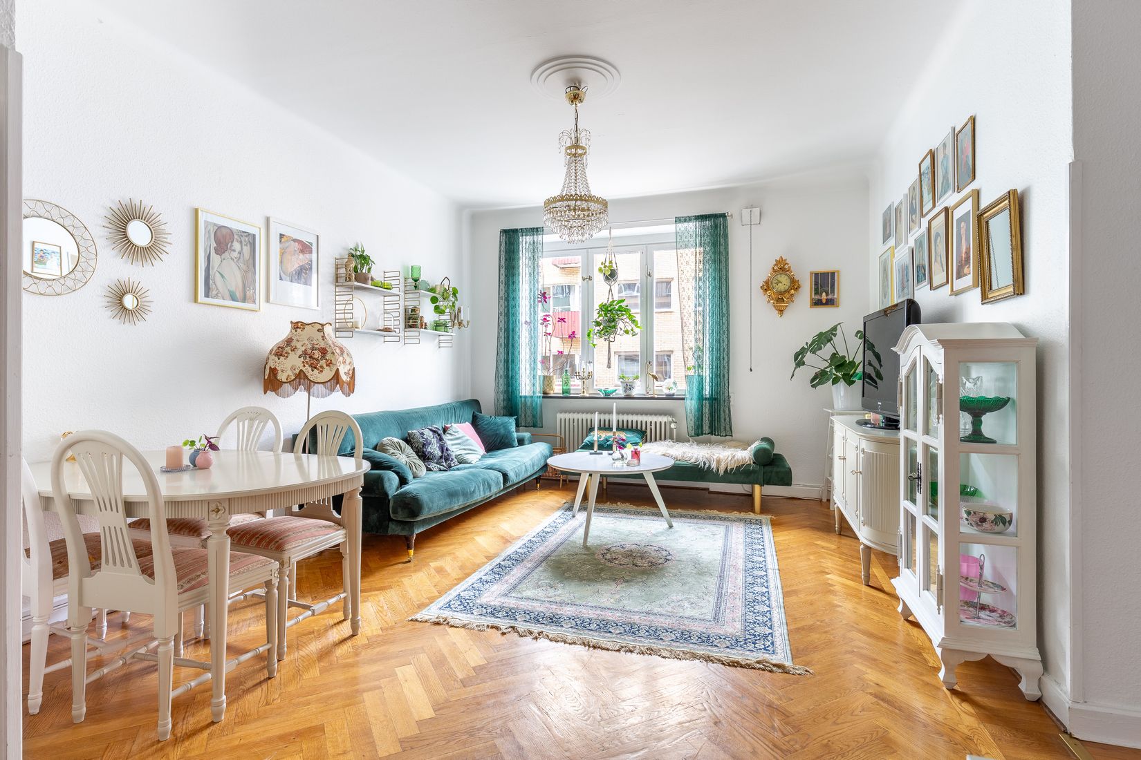 Bostaden, som ursprungligen bestod av två ettor, har slagits samman och erbjuder nu två och en halv rum och kök med en unik planlösning. Fastigheten är från 1936 med flera tidstypiska detaljer bevarade, såsom tre stycken takrosetter, fiskbensparkett, brädgolv och fönsterbrädor i sten. Byggåret innebär också en högre takhöjd än dagens standard, vilket ger bostaden en härligt luftig känsla med gott om utrymme.