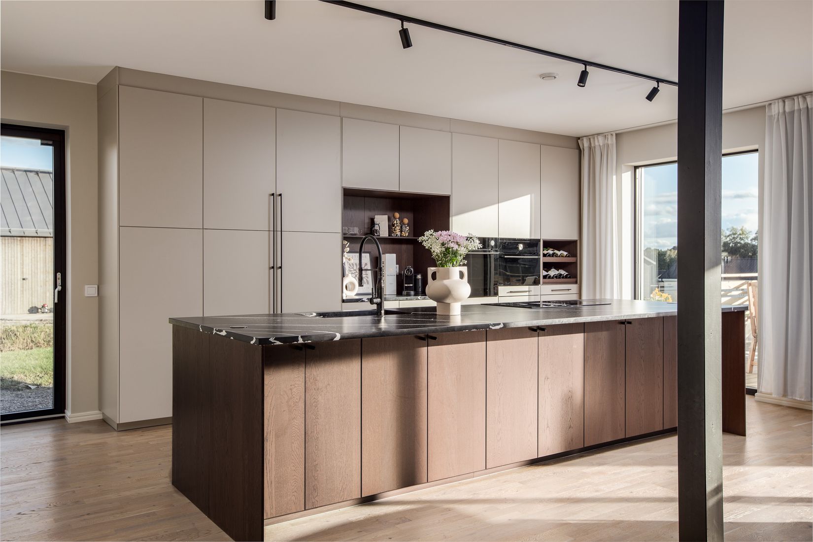 Interiört präglas hemmet av en genomtänkt planlösning och stilrena färgval som harmonierar med varandra. Köket, designat av nuvarande ägare, är verkligen hemmets hjärta och har en imponerande köksö med en kompositstenskiva på hela 3,6 meter. Här finns gott om plats för matlagning, umgänge och förvaring, med praktiska och snyggt inbyggda vitvaror som kyl, frys, ugn, kombiugn och vinhylla. En vacker kaffestation är placerad centralt, vilket skapar en inbjudande atmosfär. Stora pardörrar leder ut till altanen, vilket suddar ut gränsen mellan inne och ute under de varma månaderna.