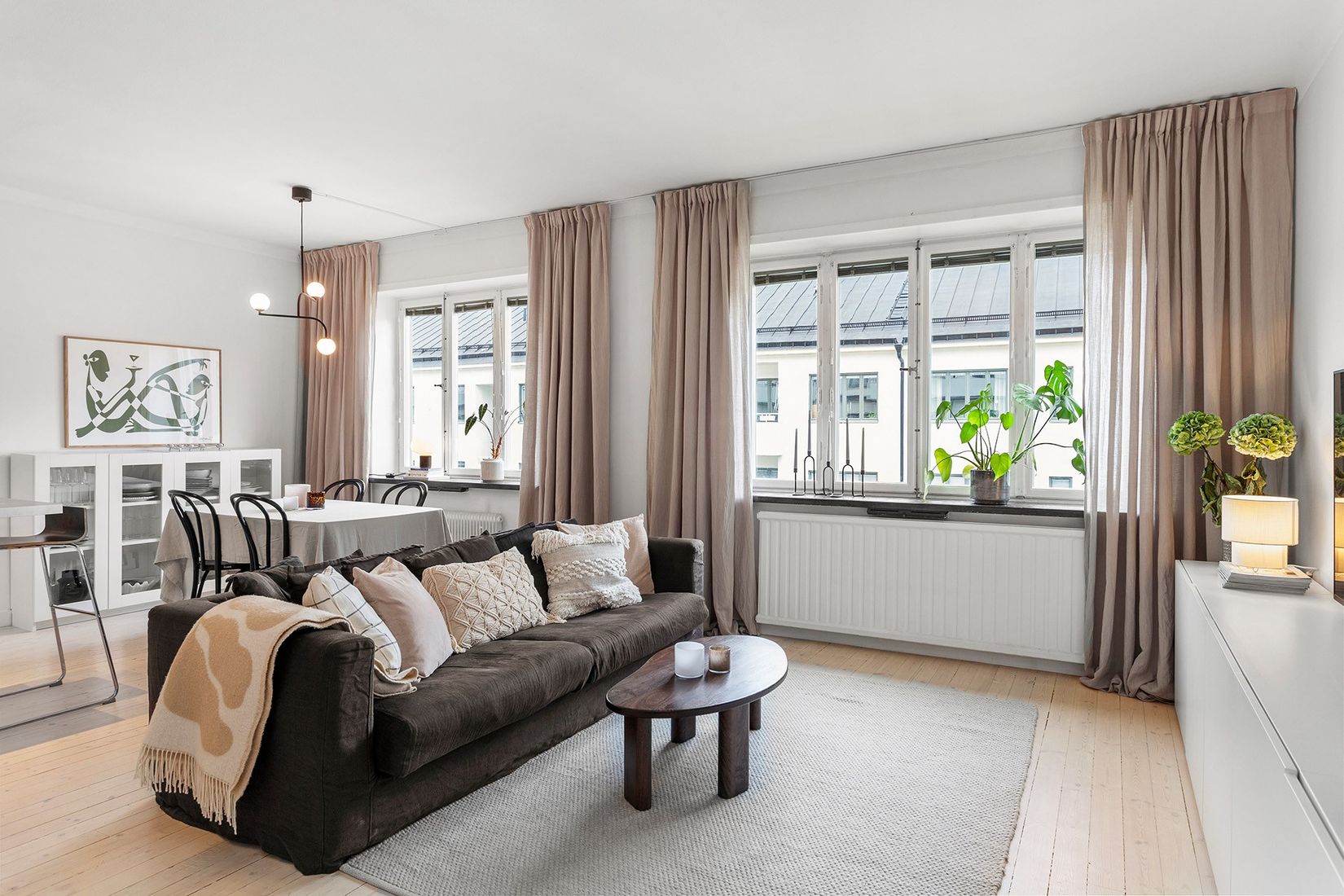 Redan i hallen märks bostadens kvalitet med smart förvaring och en inbjudande känsla. Vardagsrummet badar i ljus från stora fönster och erbjuder generös plats för både sällskapsdel och ett större matbord. Den öppna planlösningen mot köket skapar en social och modern helhet, och köksön blir snabbt den naturliga samlingspunkten vid såväl vardagsmiddagar som helgens mingel. I passagen mot hallen finns dessutom perfekt utrymme för extra garderober eller en stilfull arbetsplats.