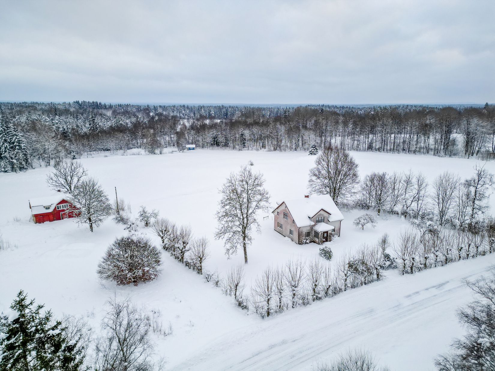 Fastigheten består av boningshuset, en ladugård samt en stuga som på sin tid använts som syfabrik, fem hektar mark, en liten damm med brygga och tillhörande friggebod. Boningshuset är i stort renoveringsbehov.
