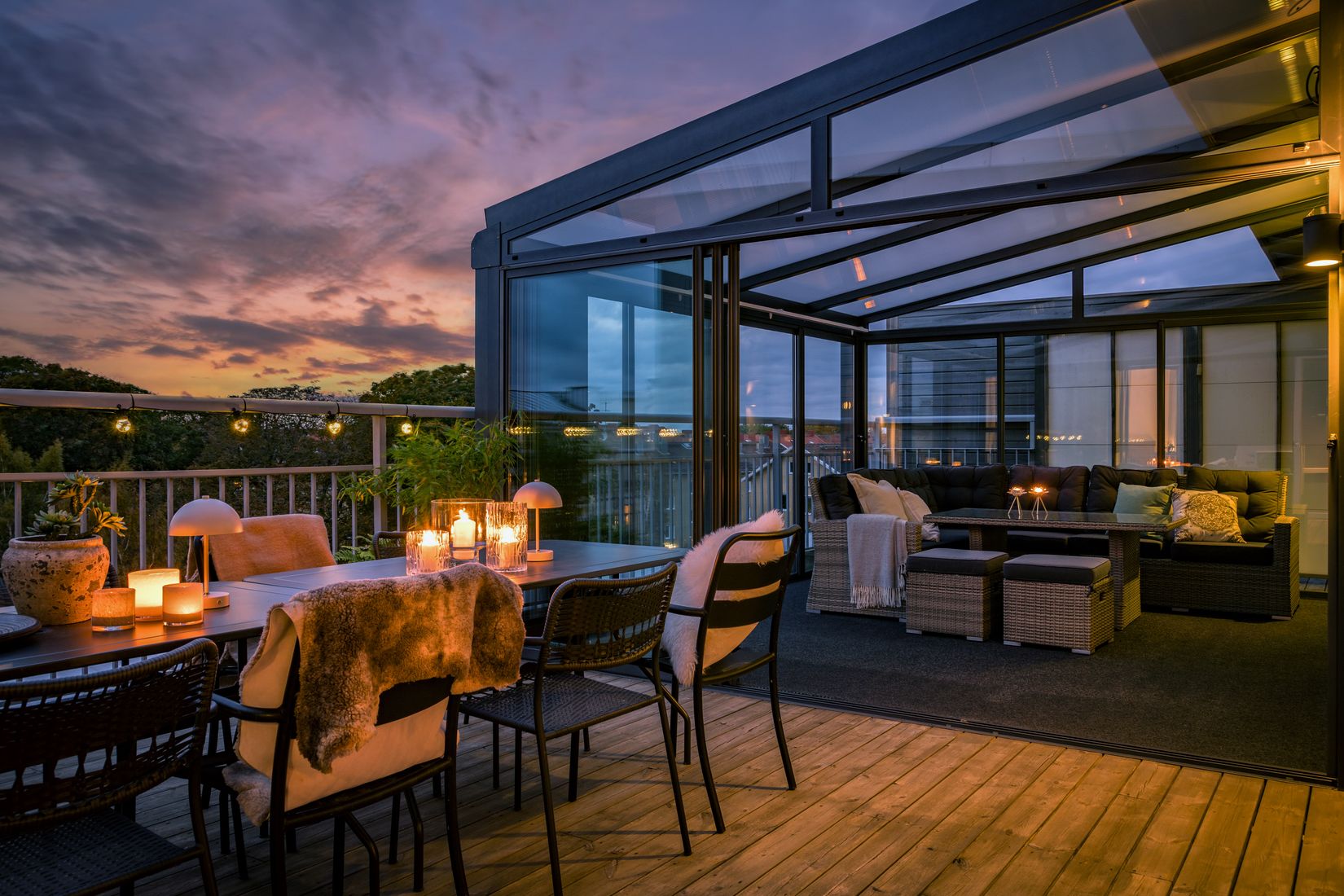 Med gångavstånd till stadskärnan och en inramning av grönska från parken och ståtliga trädalléer öppnar sig raderna av modernistiska vita hus. Här bor du i ett hem som du äger själv, likt en villa, fast på höjden och med tillgång till alla bekvämligheter som en förening erbjuder. På det femte och högsta våningsplanet, rakt under himlavalvet sträcker lägenheten med två terrasser ut sig. Utförandet är unikt av sitt slag i Kristianstad och förmedlar en tydlig penthouse-karaktär.