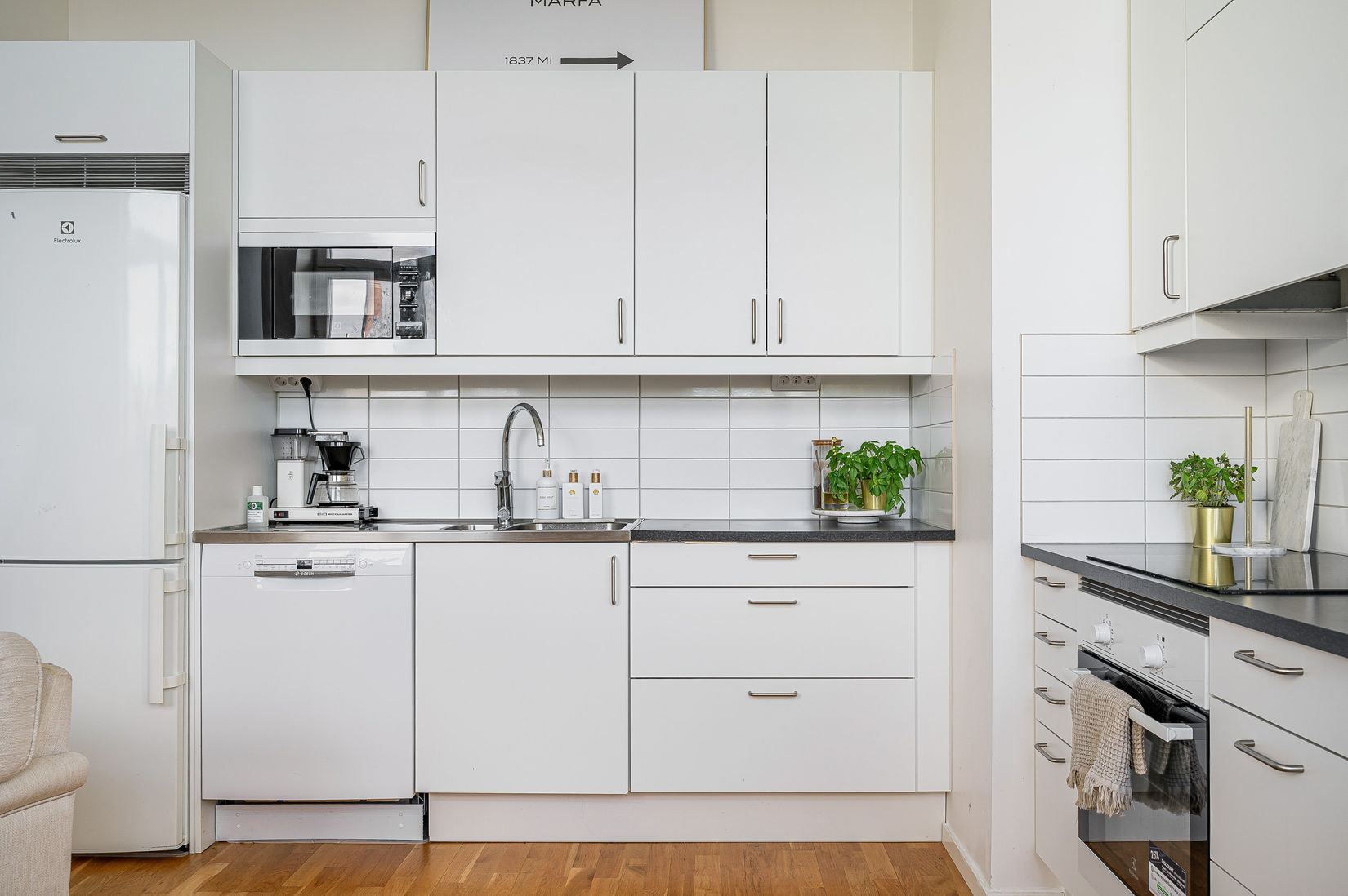 Köket och vardagsrummet samsas i en öppen planlösning där stora fönster släpper in rikligt med ljus. Detta luftiga och sociala utrymme är som gjort för att samla nära och kära. Sovrummet ligger strategiskt placerat på andra sidan av lägenheten.