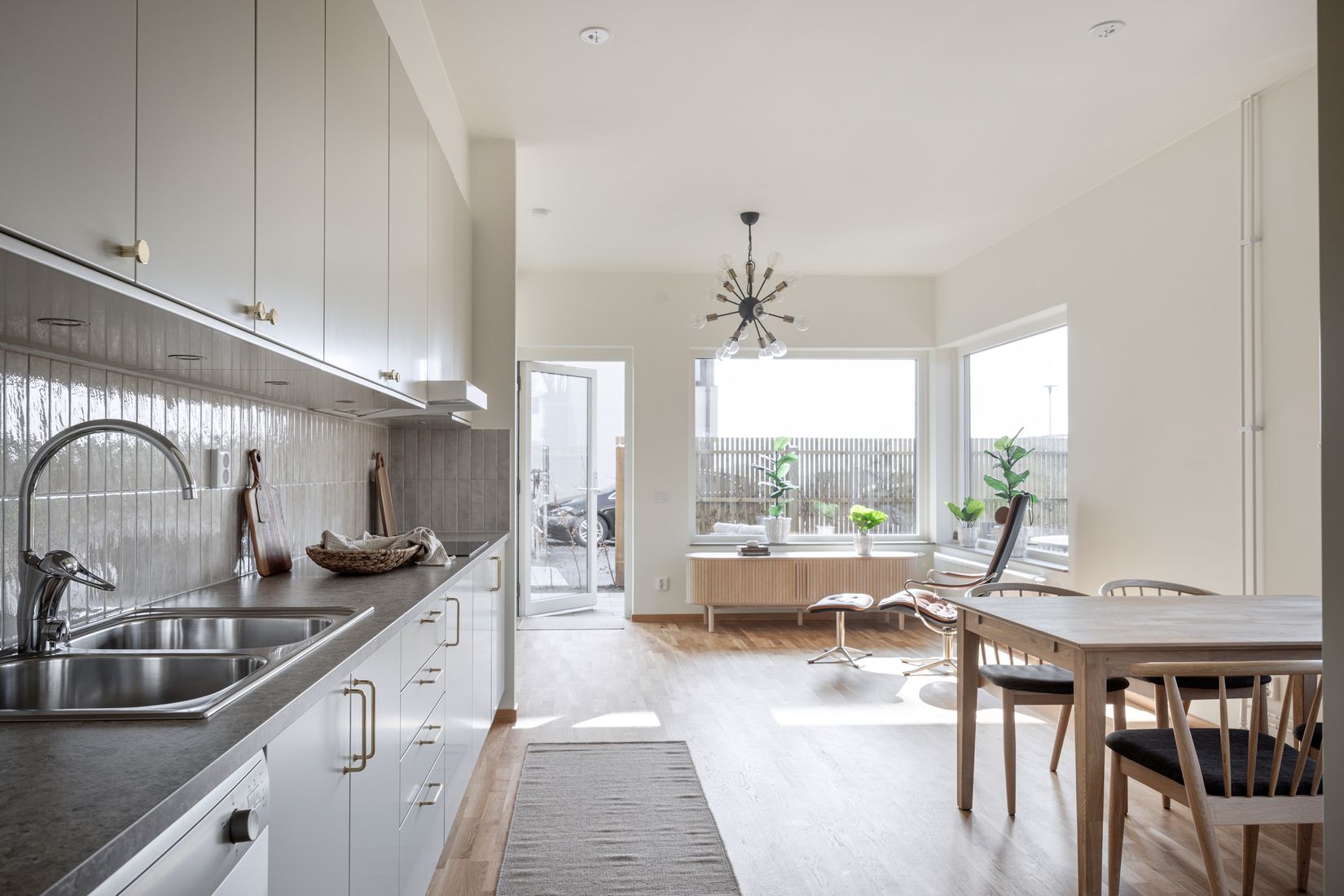 Bostaden i sig erbjuder totalt 84 väldisponerade kvadratmeter ( varav förråd inomhus om 5 kvm ) med en takhöjd på ca 3 meter! Planlösningen är öppen och ljus och just denna lägenhet har ett eget invändigt lägenhetsförråd. Väggarna i huset är tilltagna varför driftkostnaderna via fjärrvärme förväntas bli relativt låga. Ta tillfället i akt och förvärva en enastående lägenhet i ett plan, med totalt två uteplatser!