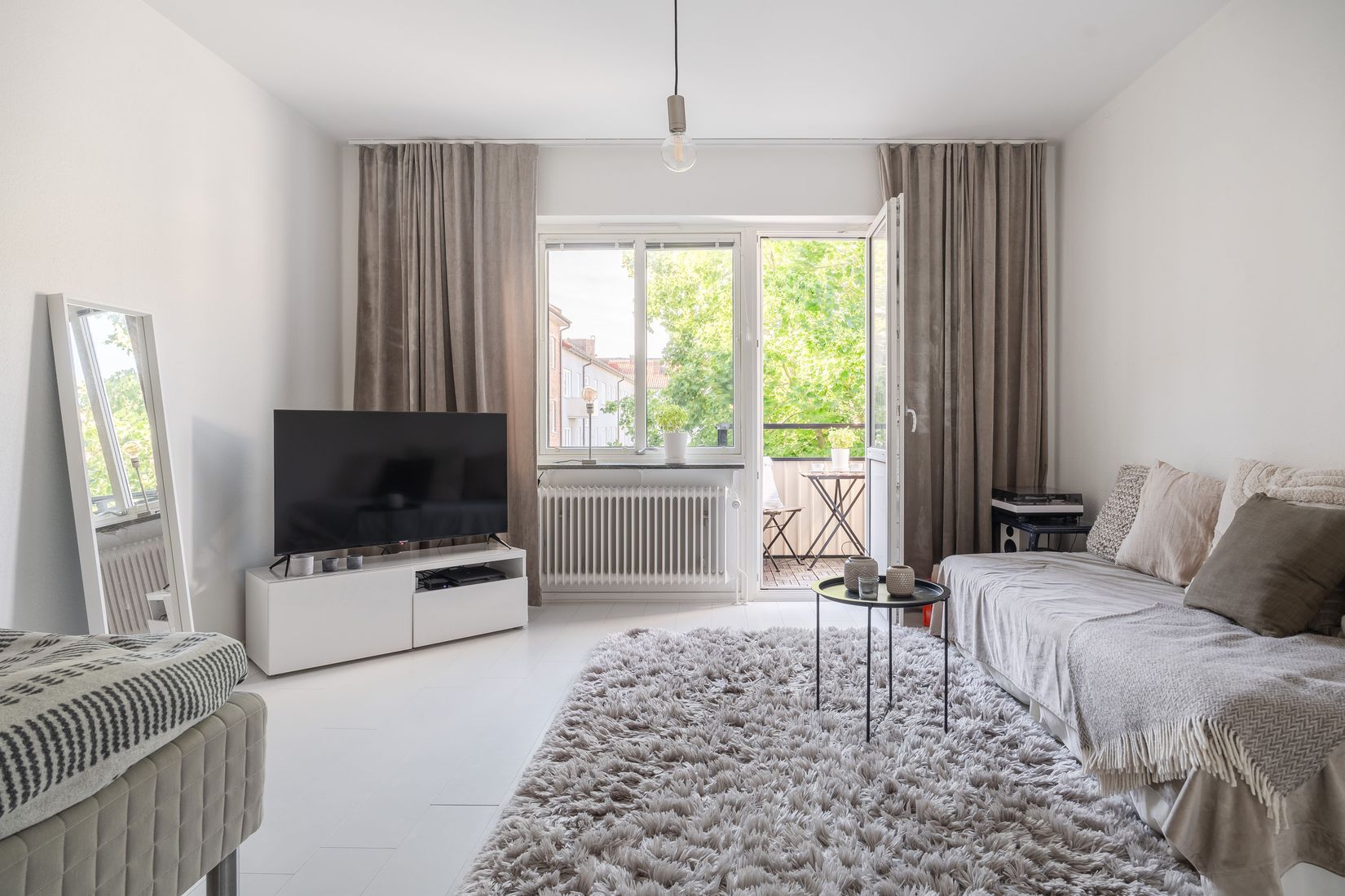 Lägenheten välkomnar oss in i hallen med såväl avhägningsmöjligheter som garderob. Till höger finner vi det rymliga köket med goda arbetsytor och den maskinella utrustningen består av spishäll, köksfläkt, ugn i arbetshöjd, diskmaskin samt kyl och frys. Här inne lämnas även utrymme för att få plats med matbord. Vardagsrummet med sina stora fönsterpartier ger ett härligt ljusinsläpp som ger rummet en luftig känsla. Här möblerar du in säng, soffgrupp, tv samt tvbänk utan att den luftiga känslan försvinner. Den mysiga balkonen i solsäkert västerläge har utsikt över föreningens lugna innergård och under årets varmare dagar öppnar du med fördel upp balkongdörren för att förlänga lägenhetens sociala ytor.