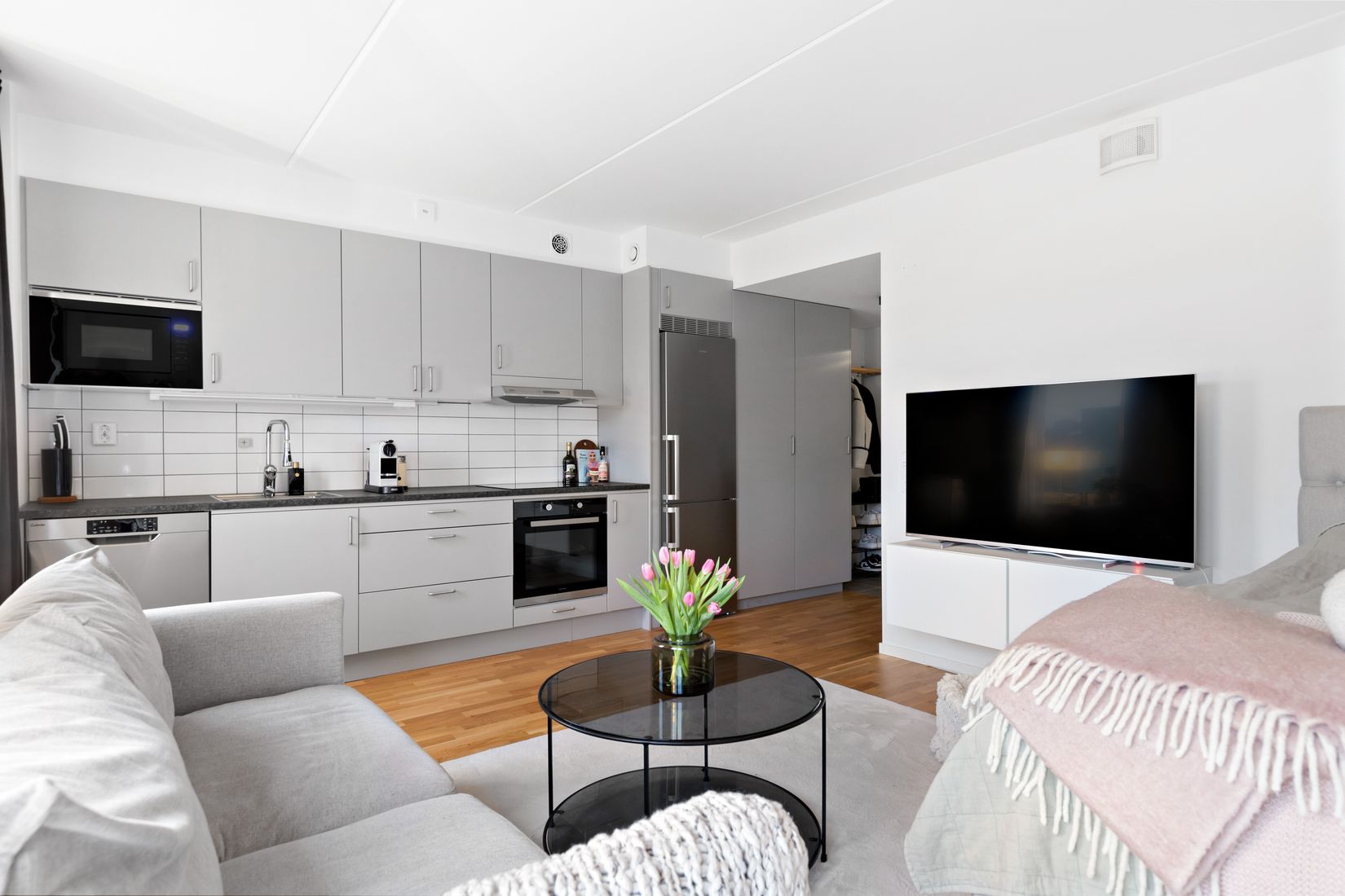 Den här lägenheten är smart designad för att erbjuda både hög funktionalitet och en trivsam miljö. Stilrena färgval och moderna material bidrar till en harmonisk och inbjudande atmosfär. Bostadens höga och avskilda läge ger en känsla av privathet, medan de stora fönstren släpper in generöst med naturligt ljus. Köket, från Vedum, håller toppkvalitet och är perfekt utrustat för att inspirera till matlagning och kreativitet. Golven pryds av en elegant ljus ekparkett som förstärker den moderna stilen.