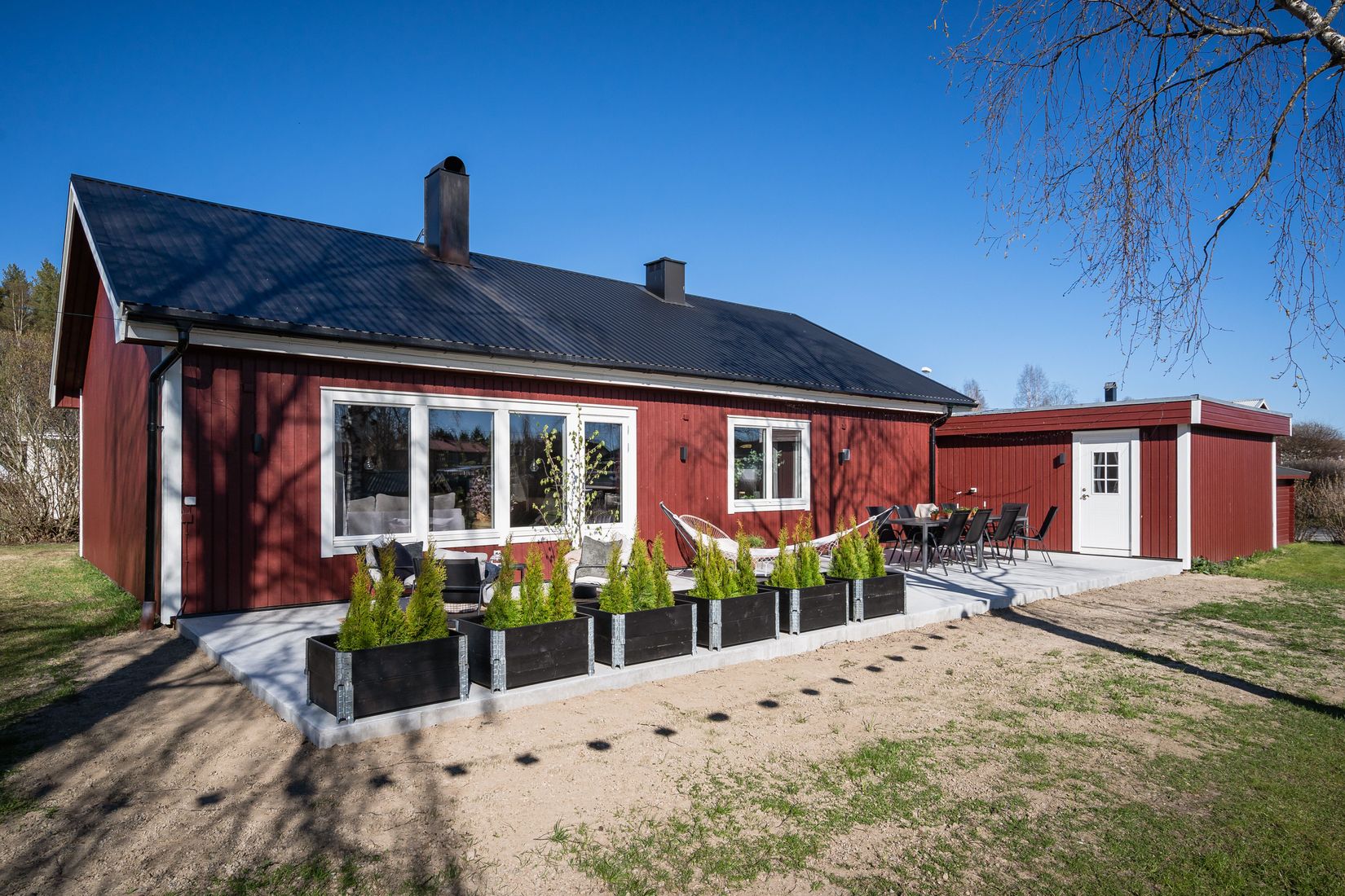 Utomhus erbjuds en välskött tomt i söderläge som gränsar till lekpark – ett optimalt läge för barnfamiljen. Den stora altanen om ca 70 kvm (2024) skapar fantastiska möjligheter för sociala tillställningar, grillkvällar och avkoppling i solen.
