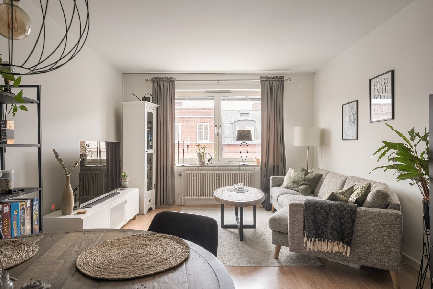 Tre våningar upp finner vi denna tvårummare med bland annat ett vardagsrum som har generöst ljusinsläpp från stora fönsterpartier i västerläge. Här erbjuds det plats för placering av större soffgrupp och matgrupp utan att behöva kompensera med utrymmet. Vidare i lägenheten finner vi ett sovrum med bra förvaringsmöjligheter i form av nya generösa garderober. I köket finner vi generöst med förvaring, rikligt med arbetsytor samt moderna vitvaror. Badrummet är renoverat av föreningen under deras stambyte 2007.