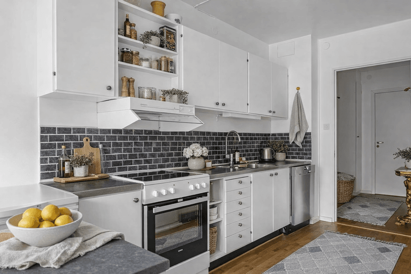 Slutligen kommer vi till det ljusa och trivsamma köket, som är både funktionellt och stilrent. Här finns gott om förvaringsmöjligheter för köksredskap och matvaror, vilket gör matlagningen enkel och inspirerande. Den smarta planlösningen skapar utrymme för både matlagning och umgänge.
