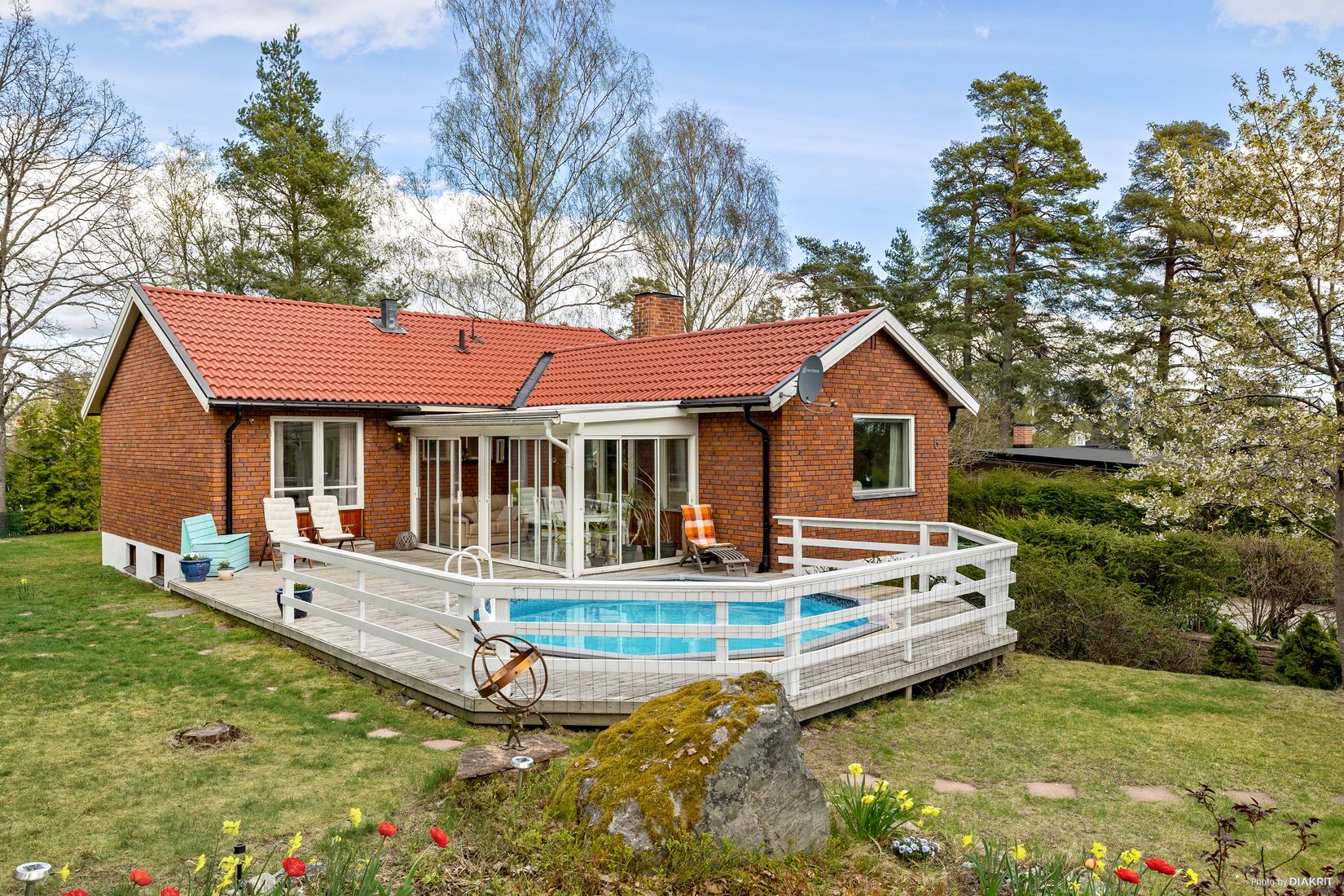 På den rymliga uppfarten finns plats för flera bilar, och i trädgården väntar en inbjudande pool för soliga dagar.