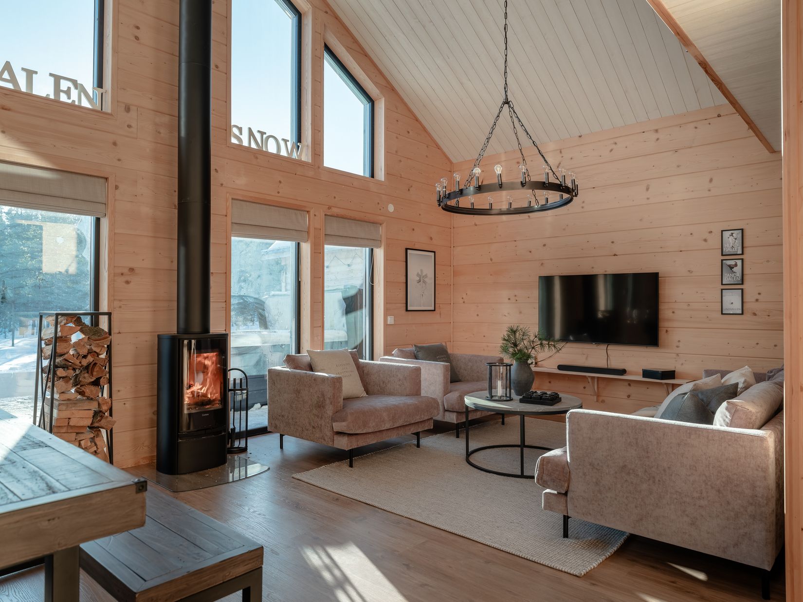 Husets hjärta är storstugan med ryggåstak, braskamin och stora fönsterpartier som bjuder på en öppen vy mot myren och Lindvallens pister. Ljuset från sydväst fyller rummet och förlänger känslan av rymd. Härifrån kliver ni rakt ut på den generösa altanen med både bastu och spabad – den självklara samlingsplatsen efter en aktiv dag på fjället.