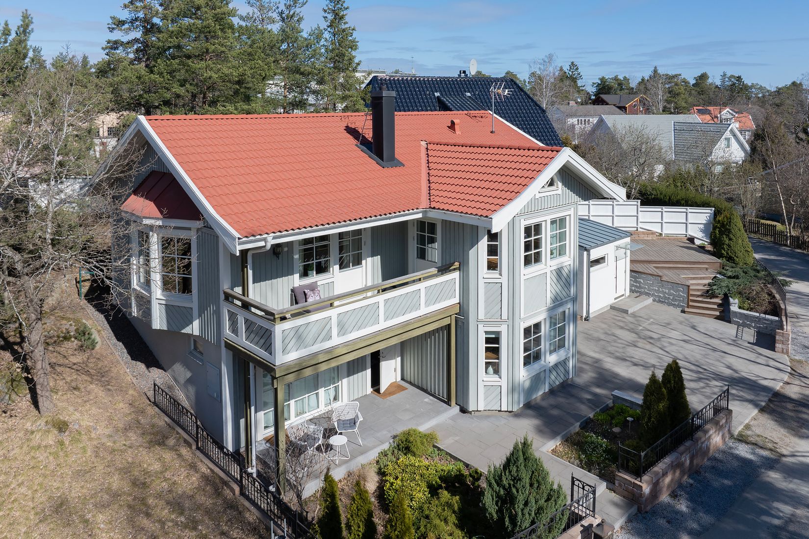 Utomhusmiljön är genomtänkt med stor altan, balkong samt stenlagd uteplats i soligt läge.