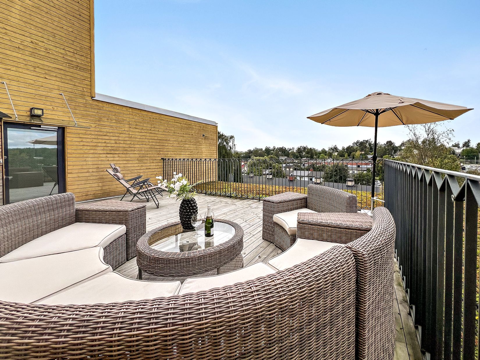 Tänk dig din egna terrass på närmare 40 kvm, där solen följer dig från frukostkaffet till kvällens sista glas vin. Här finns plats för både loungemöbler, grill och långbord - en privat oas som förlänger vardagsrummet och bjuder in till allt från lata sommardagar till stämningsfulla kvällar. Spotlightsen i trädäcket bidrar till att skapa en inramad och lyxigare känsla. Dessutom finns en separat ingång till trädäcket och ett eget förråd för extra bekvämlighet.