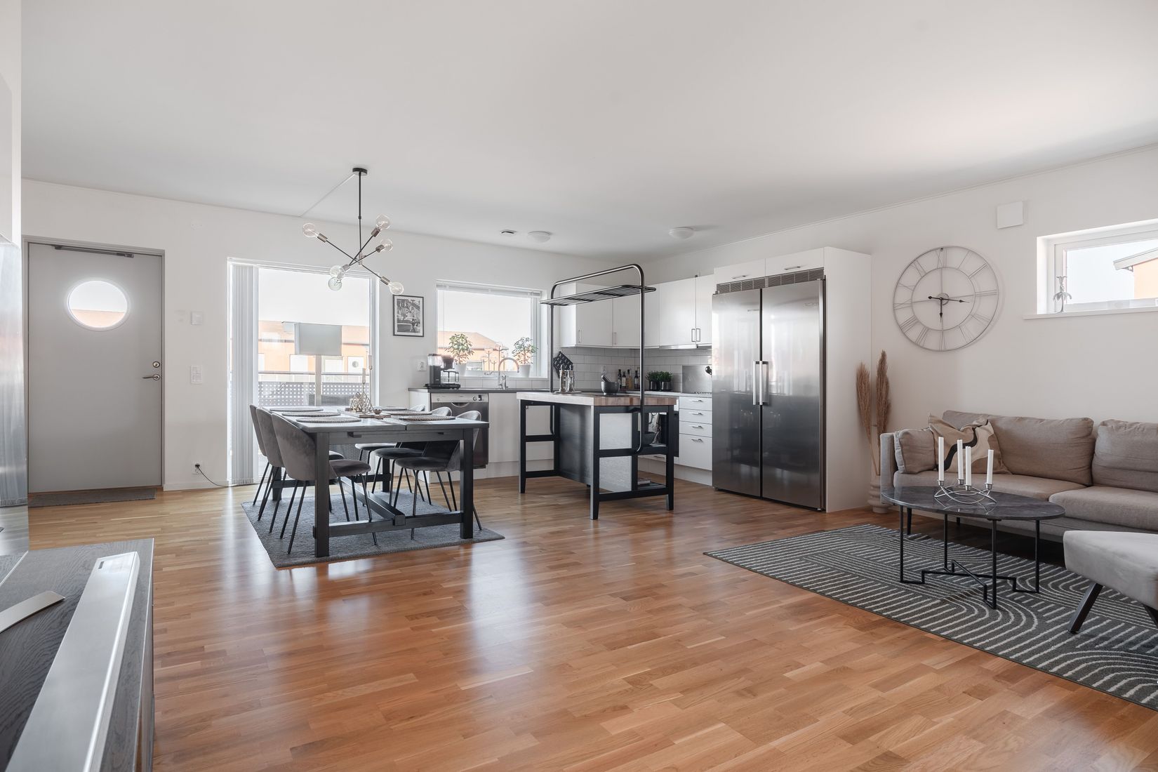Lägenheten erbjuder väl tilltagen öppen social yta i vardagsrum och kök som har en fin samvaro sinsemellan.