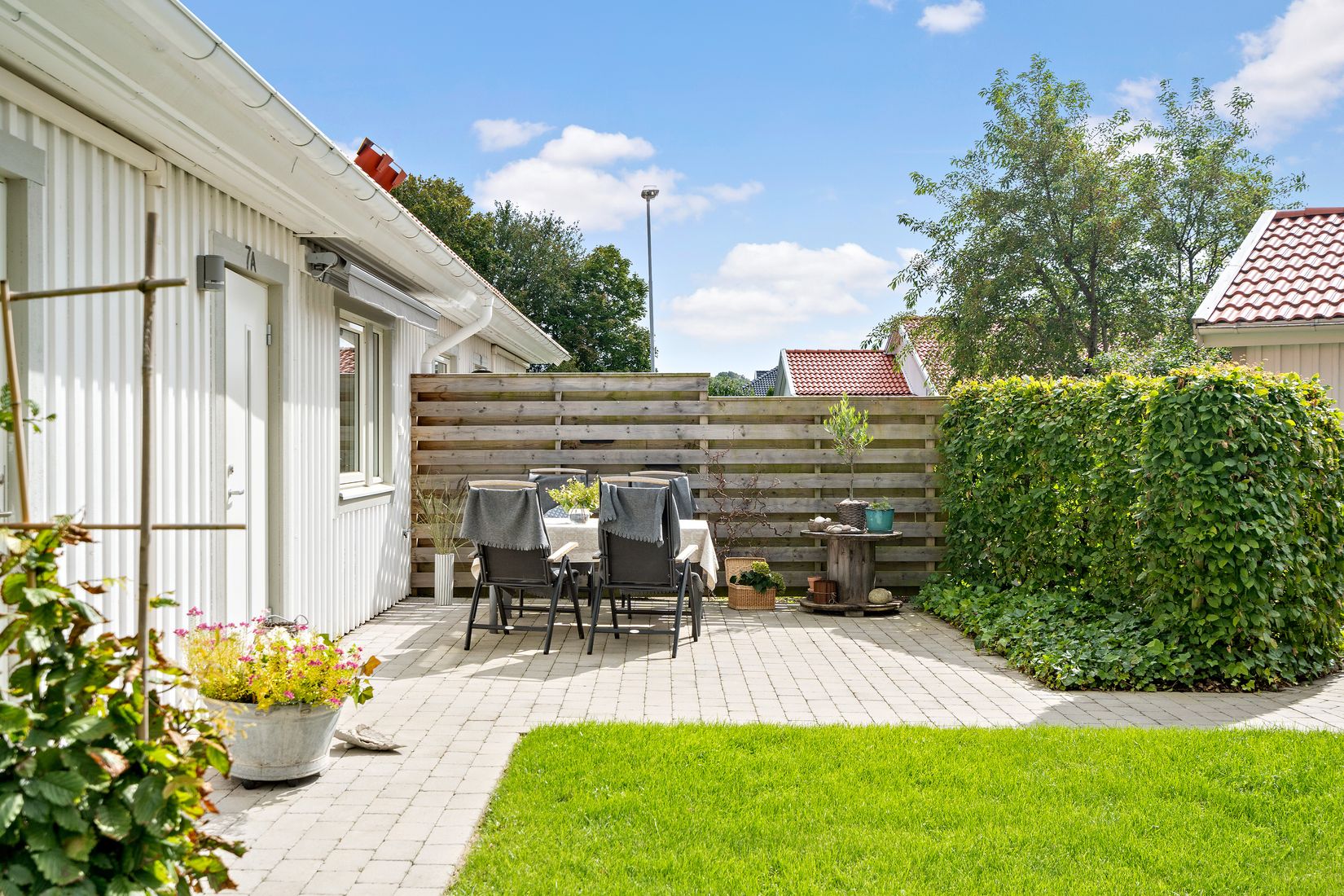 Detta familjevänliga och välunderhållna bostadsrättsparhus om två våningar är beläget i centrala Frillesås och erbjuder en bekväm och trivsam boendemiljö. Bostaden är placerat på ett avskilt läge i området vilket ger en privat och ostörd utemiljö. Uteplatsen i sydvästläge är stenbelagd och inbjuder till avkoppling och sociala stunder under soliga dagar. Dessutom finns en trevlig gräsmatta där barnen kan leka fritt och ett praktiskt uterum som förlänger sommarsäsongen. Den funktionella planlösningen inkluderar ett rymligt kök med plats för matbord och ett stort vardagsrum med utrymme för såväl soffgrupp som matbordsmöblemang. Bostaden inrymmer tre sovrum samt ytterligare ett mindre rum med snedtak och takfönster på övre plan - perfekt som hemmakontor eller gästrum. Därutöver finns ett badrum på vardera våningsplan varav det på entréplan erbjuder tvättutrustning. Dessutom finns en separat groventré med goda förvaringsmöjligheter. Till bostaden hör en garageplats i nära anslutning och framför garageporten finns även plats för parkering av ytterligare en bil, om så önskas.