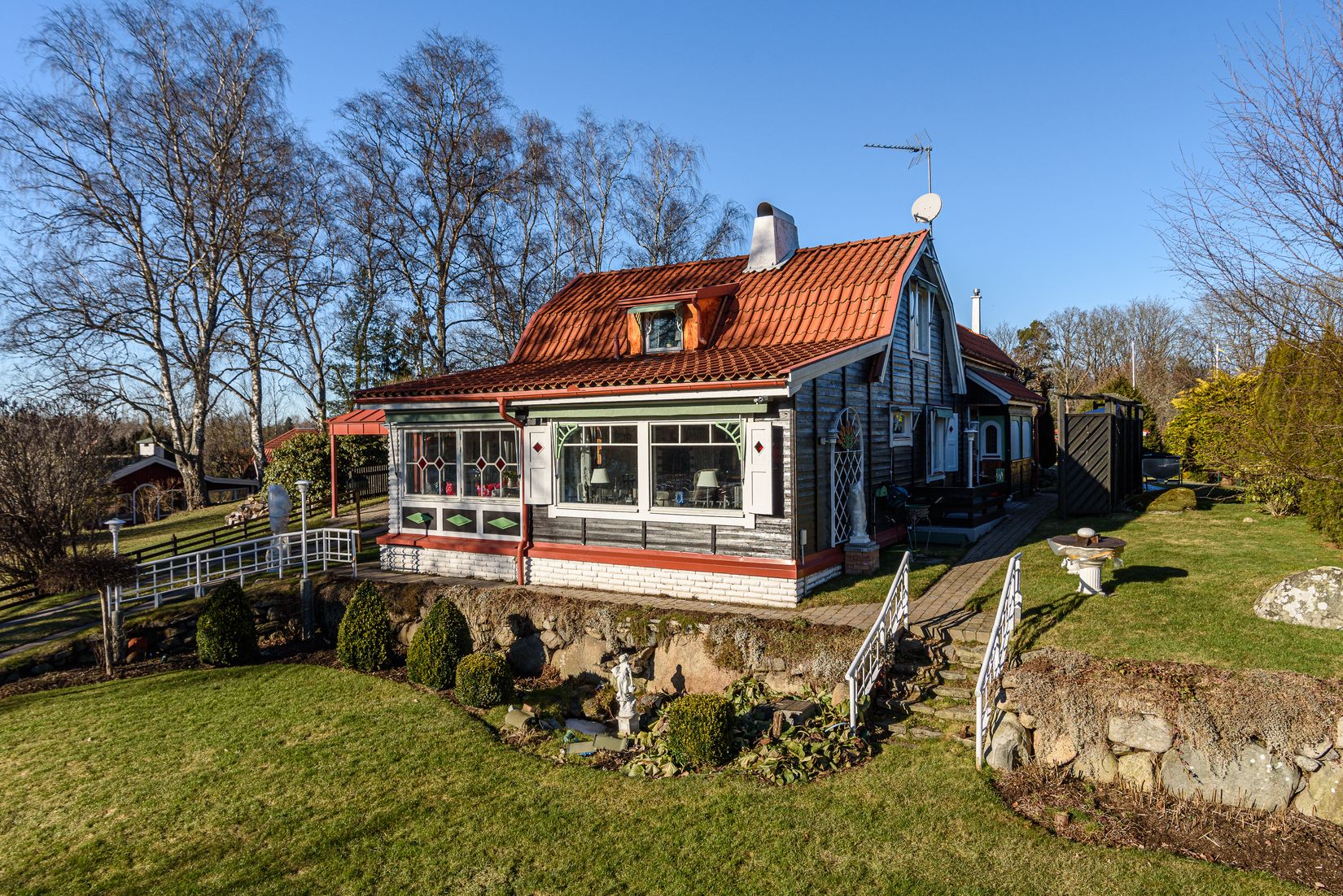 Trädgården ligger högt belägen med en härlig baksida, här finns bra med grönyta och växtlighet där familjen kan samlas. Förutom inglasad altan finns även ett orangeri, förråd, verkstad och en uppvärmd friggebod där besökare eller ungdomar kan krypa undan. Bilen parkeras i carport eller på uppfarten. Fastigheten har både kommunalt och djupborrad vattenbrunn - perfekt för trädgårdsarbetet.
