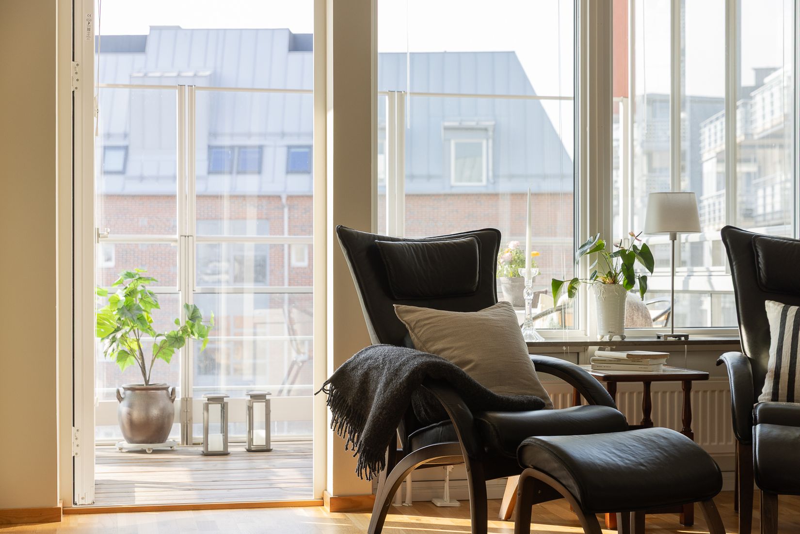 En inbjudande balkong med trätrall och höj- och sänkbart vindskydd i glas gör det enkelt att njuta av både soliga dagar och ljumma kvällar. Här kan du koppla av med en fantastisk utsikt som sträcker sig mot både bron och havet.
