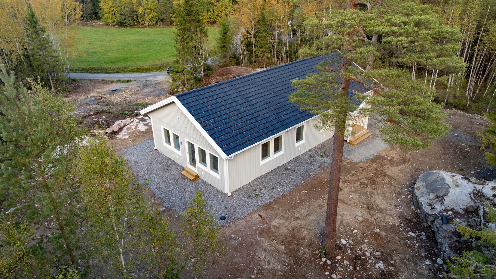 Den stora tomten om 2 147 m² levereras grovplanerad med grusad infart, och ger fina förutsättningar för en plan, grön gräsmatta – perfekt för lek, bollspel eller bara lugna stunder utomhus.