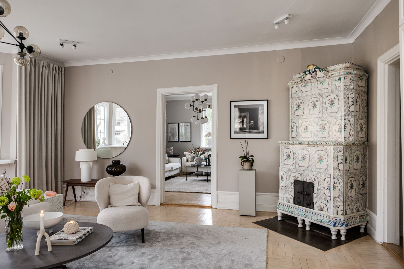 En storslagen entré öppnar dörrarna till en värld av stil och karaktär. Med sitt tak i elegant rokokostil och vackra pardörrar i ek, välkomnar huset dig in i en atmosfär av klass och komfort. Inomhus möts du av en imponerande takhöjd på 3 meter, unika takmålningar och fyra eldstäder, varav en utgör en central och inbjudande punkt i hallen.