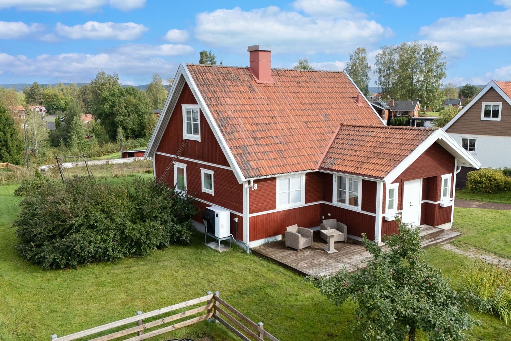 Huset står på en fin och öppen tomt med en areal om 1 016 kvadratmetrar. Här finns gott om gräsytor för lek och avkoppling med altandäck både på husets framsida och baksida. Bilen parkerar ni bekvämt i eller framför det fristående dubbelgaraget eller på parkeringsplatsen på framsidan.
