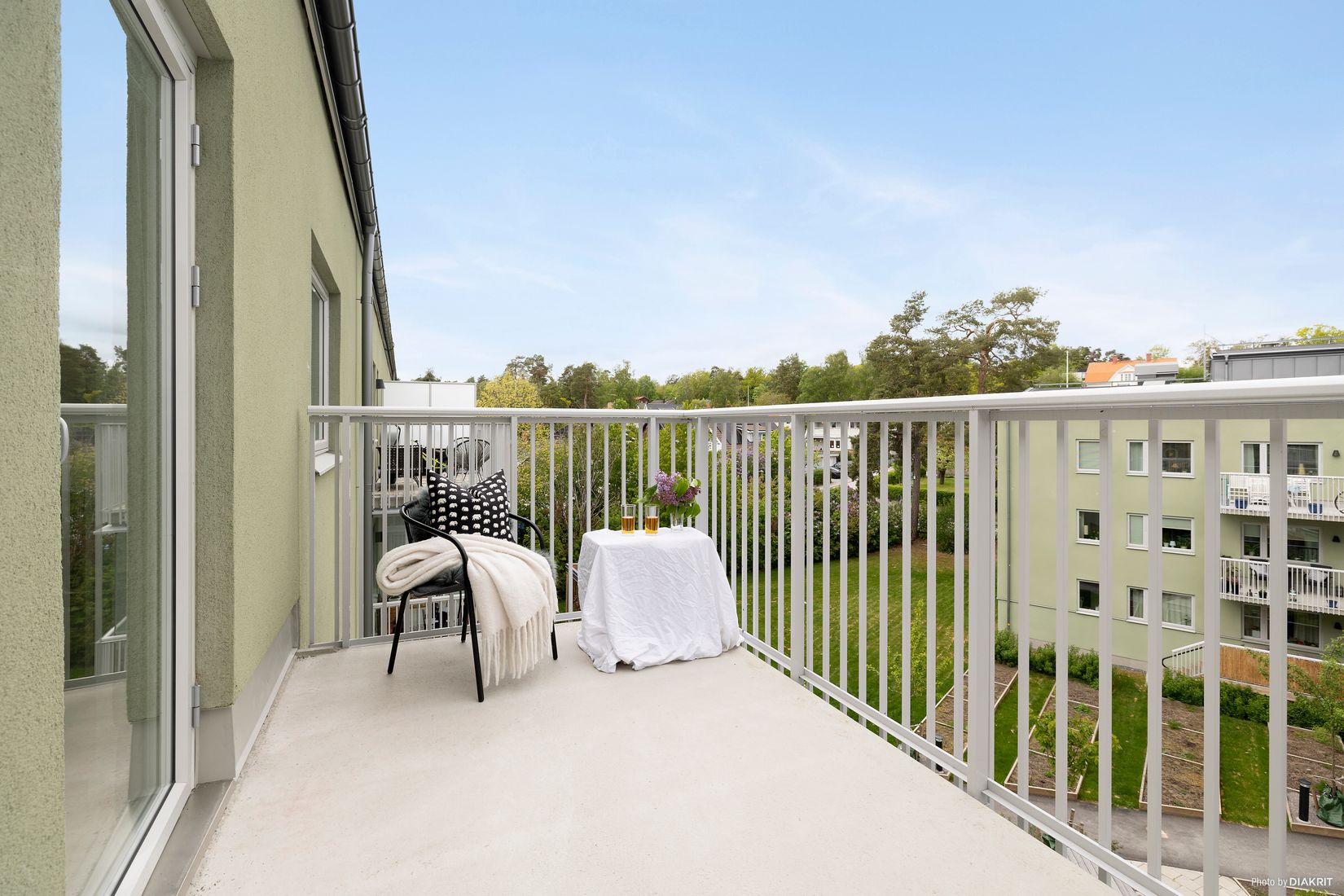 Lägenheten erbjuder ett smakfullt helkaklat badrum utrustat med dusch, wc, tvättställ med kommod samt egen tvättmaskin och förberett för torktumlare – perfekt för ett smidigt vardagsliv. Det ljusa vardagsrummet är luftigt och lättmöblerat, med plats för både soffhörna och matplats samt utgång till den rymliga balkongen. Det välplanerade sovrummet har en praktisk skjutdörrsgarderob som maximerar både rymd och förvaring.