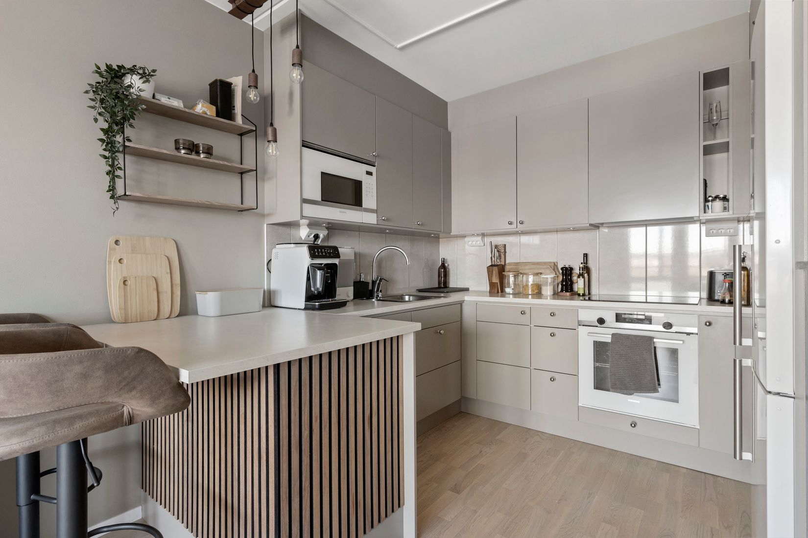 Lägenheten präglas av en ljus och luftig känsla med genomgående parkettgolv, sobra färgval och ett elegant badrum med helkaklade ytor, tvättmaskin och torktumlare. Köket är modernt och smart planerat – en perfekt plats för både vardagsmatlagning och middagar i gott sällskap.