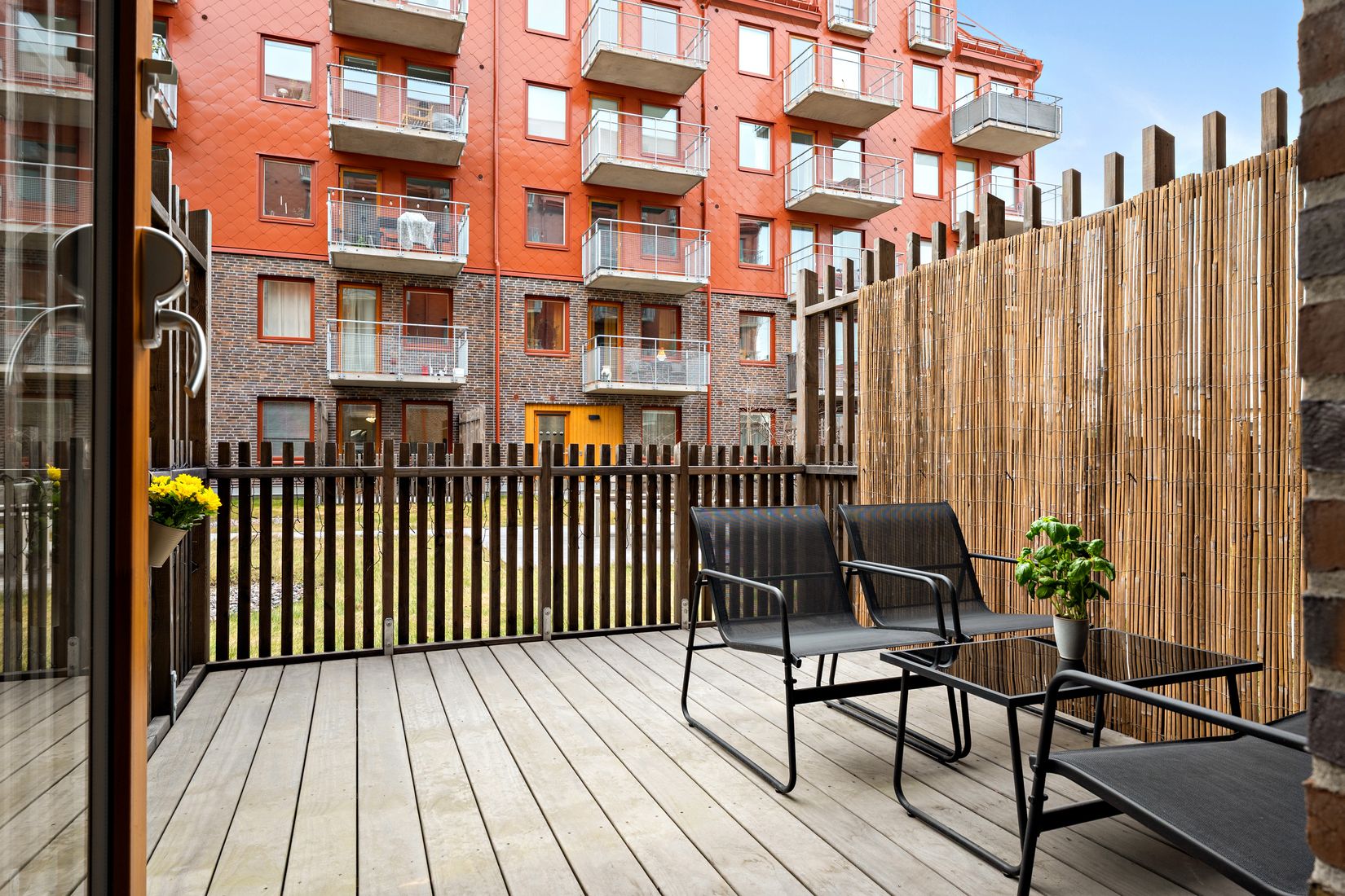 Vardagsrummet erbjuder gott om plats för både soffa och matgrupp, och tack vare stora fönster och en glasdörr ut mot uteplatsen flödar ljuset generöst in i rummet. Den härliga uteplatsen vetter mot den lugna innergården, vilket ger en perfekt plats för avkoppling.