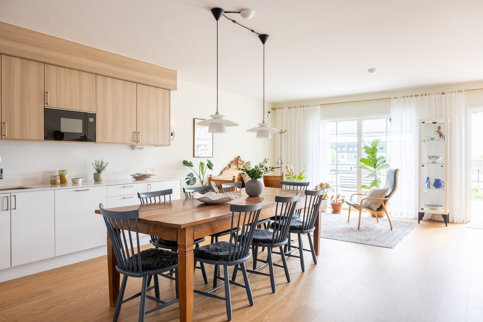 Radhuset präglas av påkostade materialval som härdat ekgolv i matt lack och bänkskivor i agglomererad sten, vilket ger en lyxig känsla. Den öppna planlösningen mellan köket och vardagsrummet skapar en ljus och inbjudande atmosfär, perfekt för sociala tillställningar och familjemys. På andra planet finner du tre stora sovrum som erbjuder gott om plats för familjens behov. Det finns även ett stilrent badrum som kompletterar detta våningsplan och bidrar till husets funktionalitet. I master bedroom erbjuds en magnifik takhöjd på ca 2,5 - 3,4 m ryggås och en stor genomgående garderob!