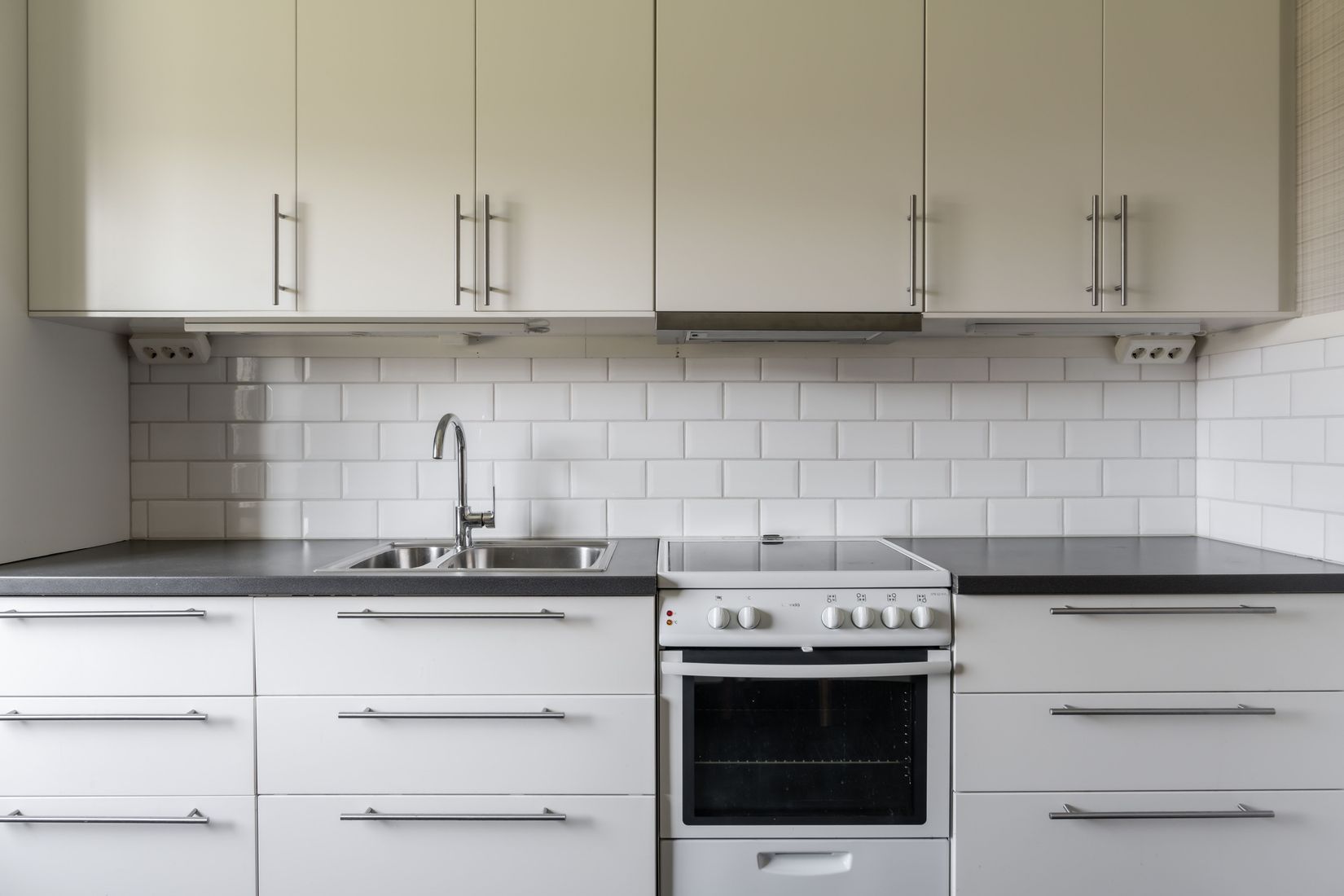 Det snygga, vita köket är renoverat i stilren design med bra förvaring och goda arbetsytor. Perfekt för dig som uppskattar både form och funktion.